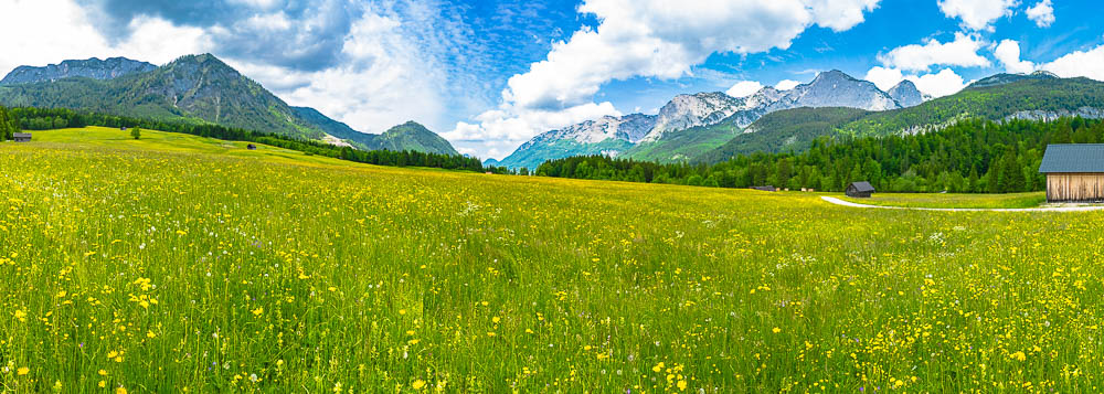 Panoramic picture of the Gössl meadows a bit above the village of Gössl. Click here or into the picture for a larger display.