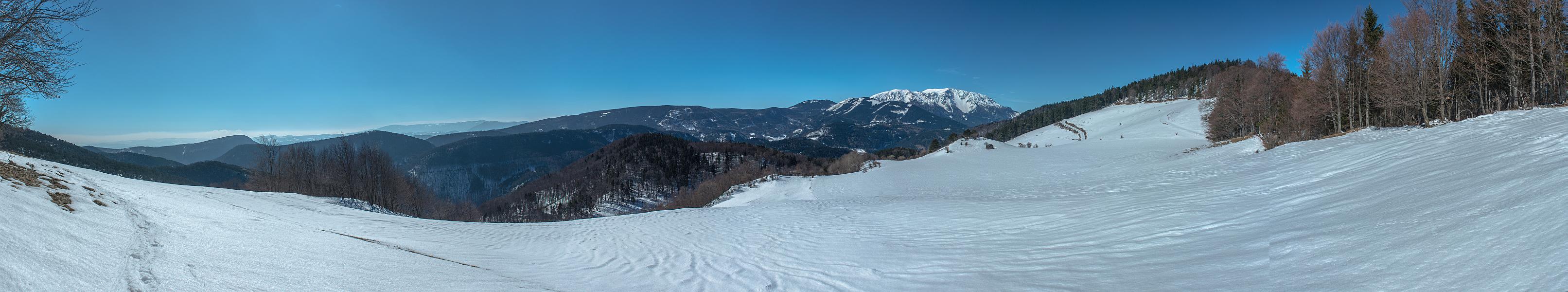 Panoramablick von der Wiese zwischen Hochberg und Kienberg. Links der Gösing, dann am Horizont die Wechselregion. Es folgt das Gahns - Massiv mit dem Krumbachstein als Höchstem, ganz rechts der Schneeberg, zwischen Krumbachstein und Schneeberg der Hohe Hengst.