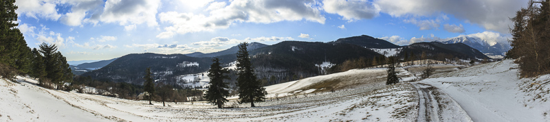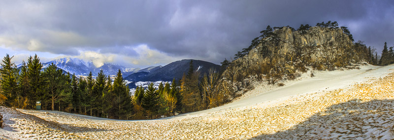 Panoramic view - Rosalia mountains, Gösing and the Gutenmann mountains with the Himberg far right, Schneeberg behind. Click here or into the picture for a larger display.