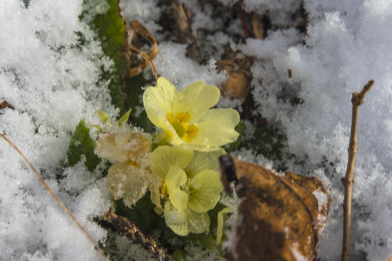 In the forest to the left, I see something yellow in the snow. A quick removal of the snow, and flowrishing primroses are revealed - seemingly a result of the extremely mild temperatures of up to 18 °C two weeks ago.