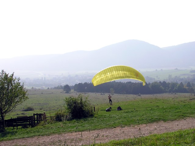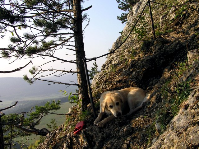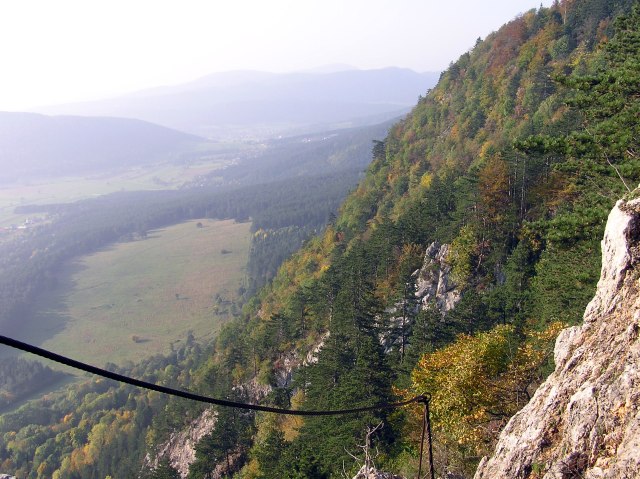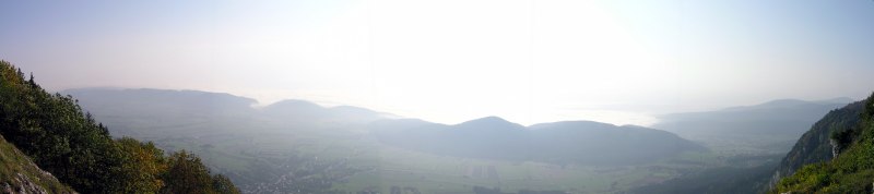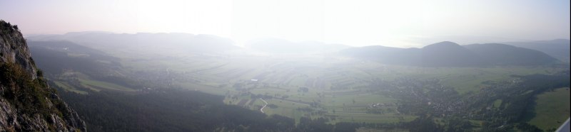 Panorama from Hochkogelhaus in direction East: still mist behind Fischauer Berge. Click into the picture for a larger version.