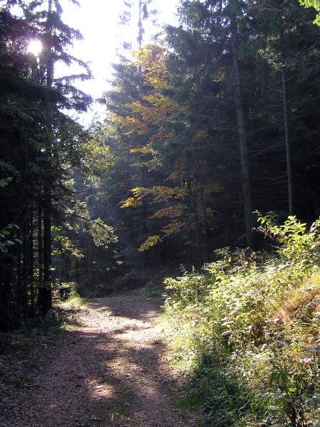 Path through the forest on Hohe Wand Plateau. The walk leads to Hochkogelhaus, where the descent begins.