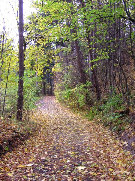 The path starts in the forest near Gruenbach´s sports fields. Most of the coloured leaves have fallen down.