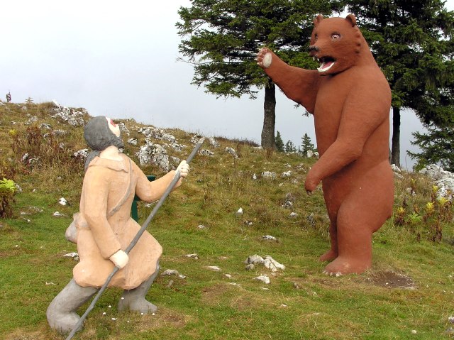On the summit plateau: Cave bear and stone age hunter (some 10.000 years ago), reconstructed in original full scale. Fully erected the cave bear measured up to 3,60 m metres, whereas stone age men measured only 1,60 m in average.