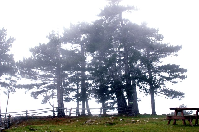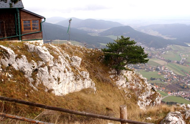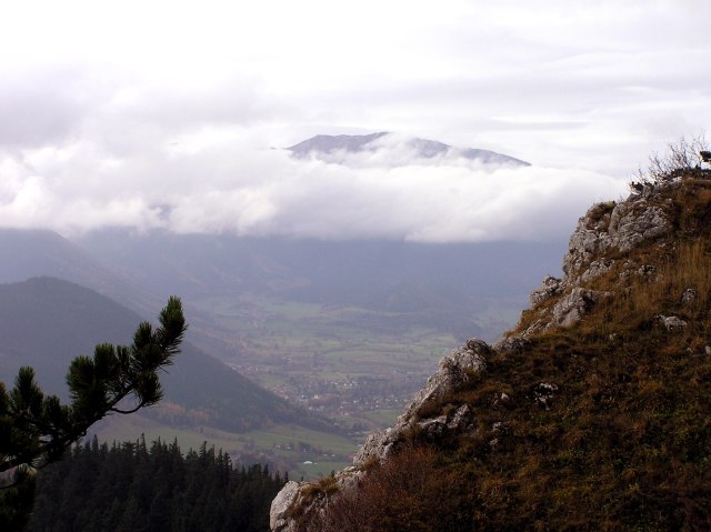 The clouds tear apart for short and permit a view on Schneeberg (2.076 m) In the foreground the rocks near Gelaende hut, behind is Puchberg.