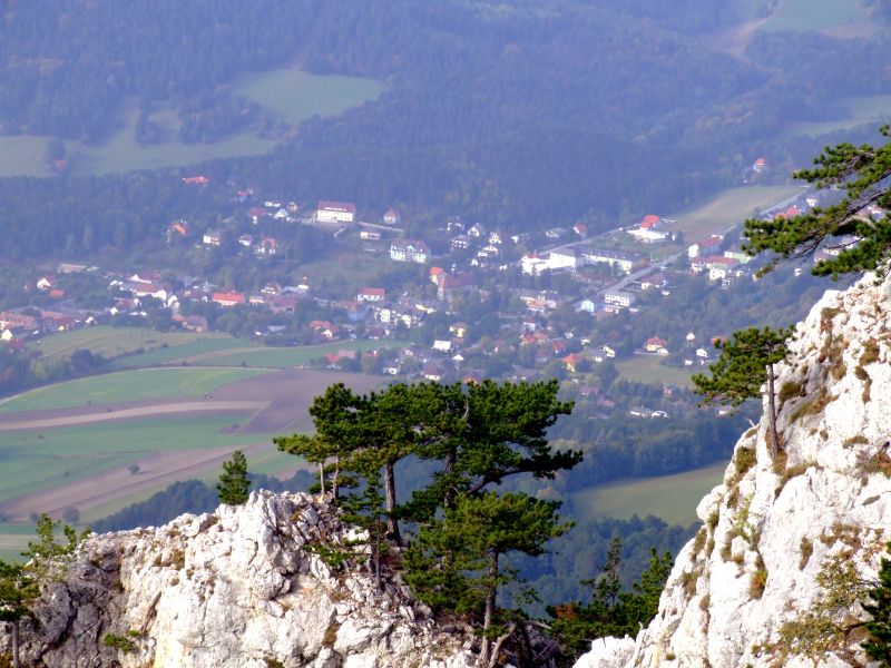 Blick die "Rückseite" der Hohen Wand hinunter Richtung Miesenbach/Scheuchenstein: Nur steile bewaldete Hänge, keine senkrechten Wandabbrüche.