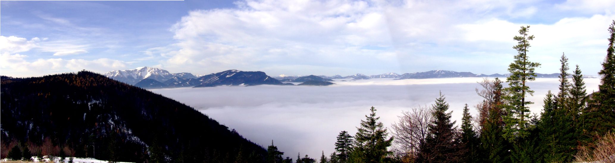 Panorama vom Waldeggerhaus Richtung Westen. Die Berge ähnlich wie von der Kleinen Kanzel aus, rechts hinter der Dürren Wand erscheint jetzt aber auch der Ötscher (1.893 m und 62 km entfernt!)