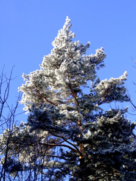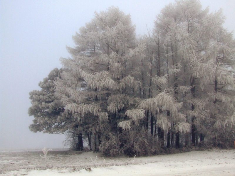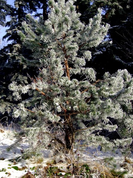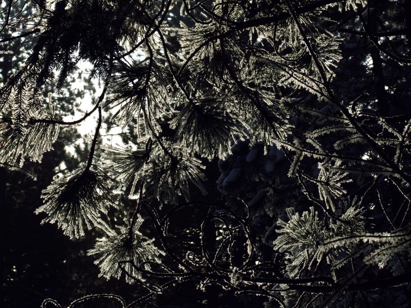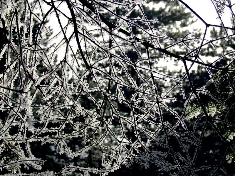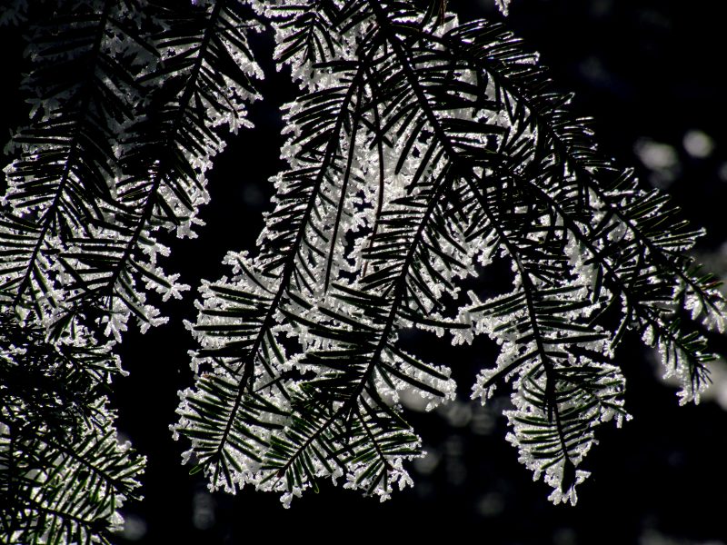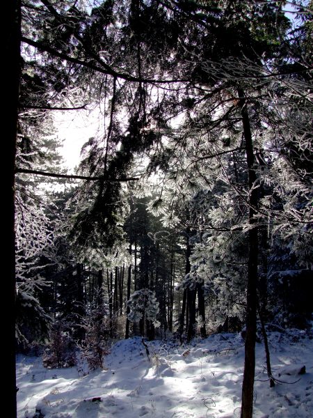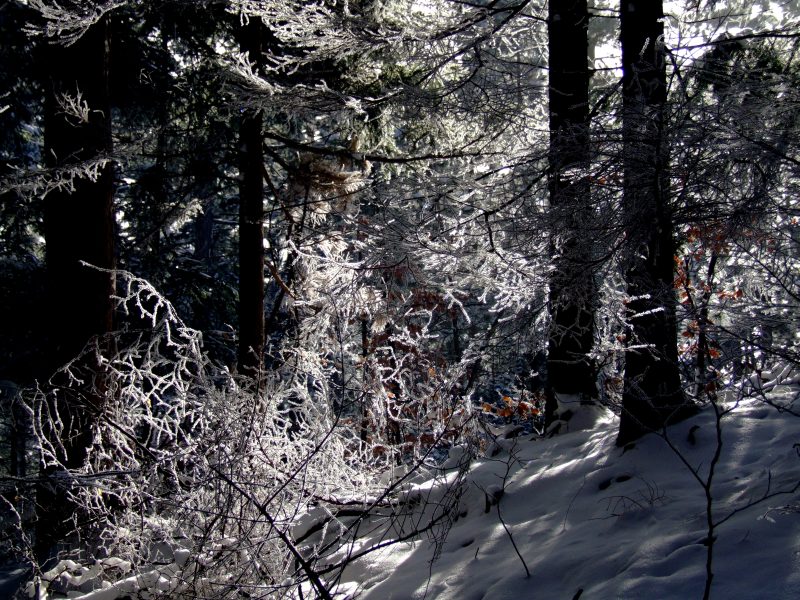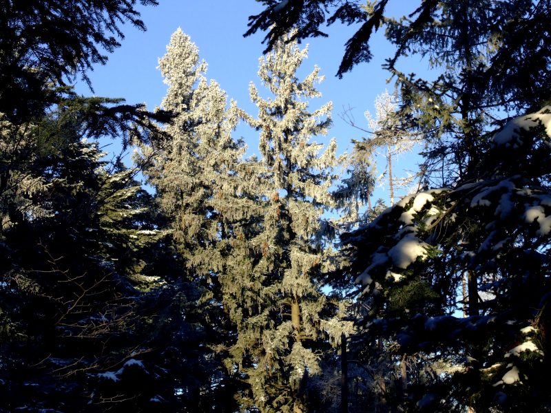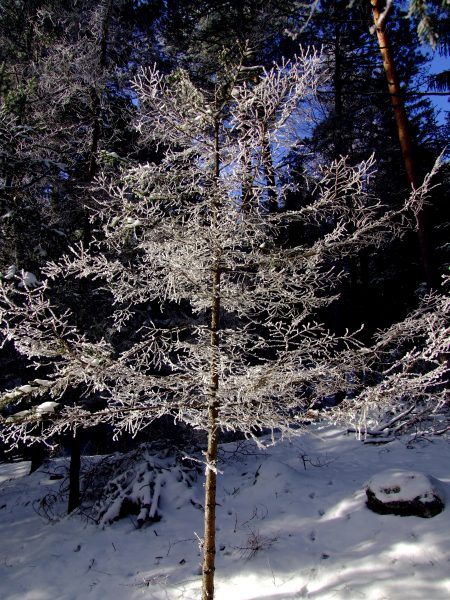 Wieder im Wald. Im Bereich der Nebelgrenze sind alle Äste und Nadeln von einer dicken Raureifschichte überzogen ...