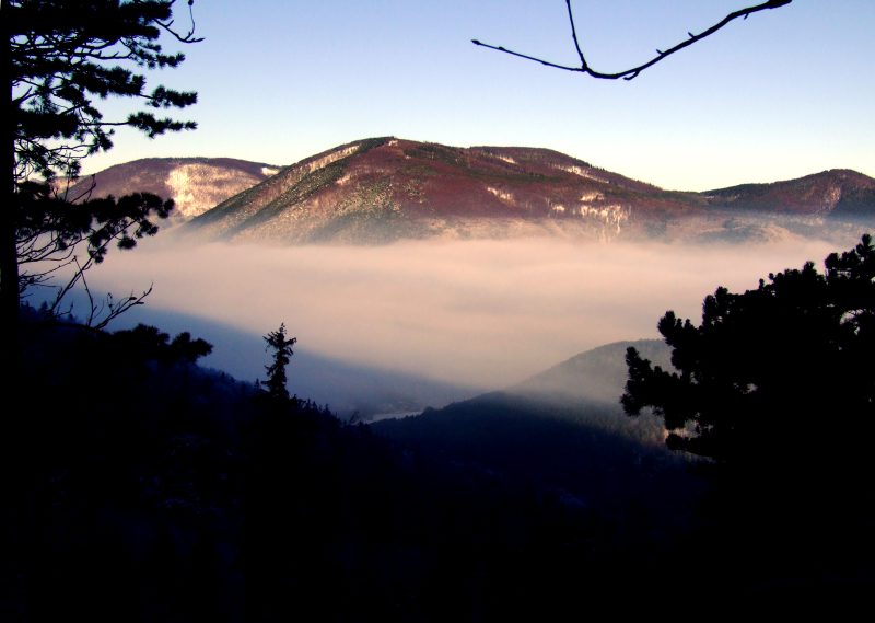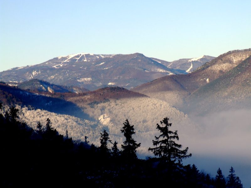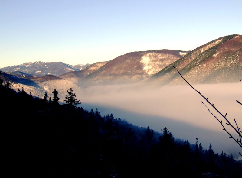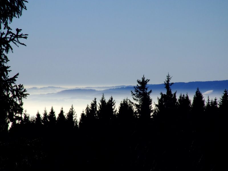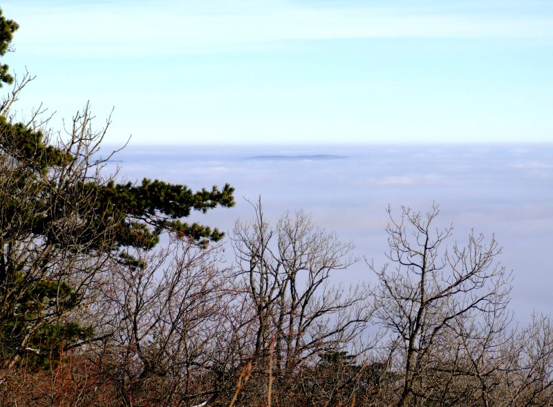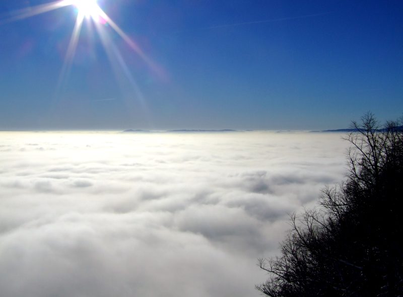 Als Inseln aus dem Nebelmeer ragt der Höhenzug des Rosaliengebirges gerade noch hervor.