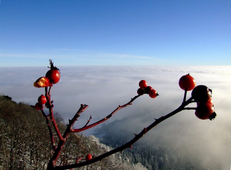 Hagebutten am Abhang, direkt über den Felsabstürzen.