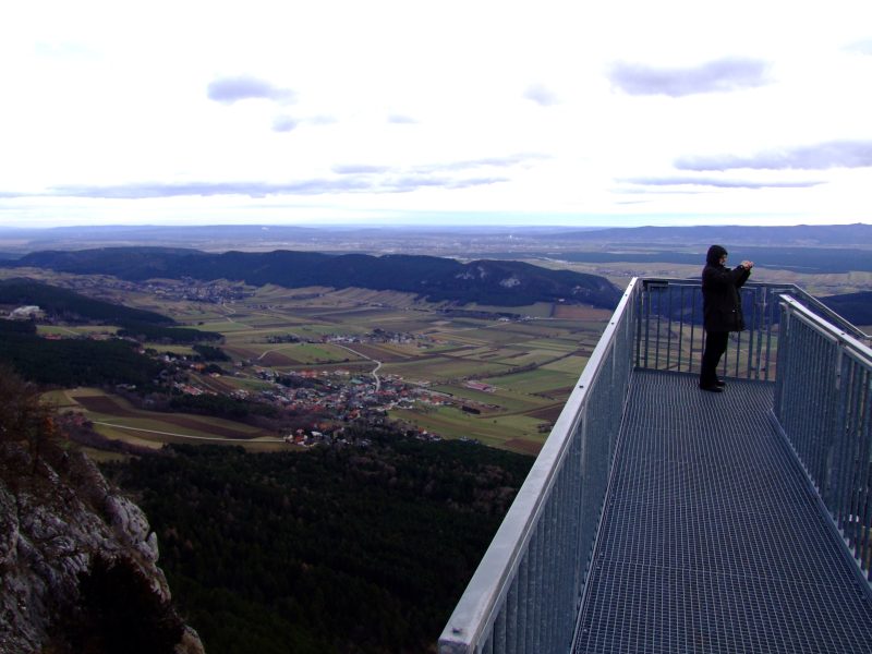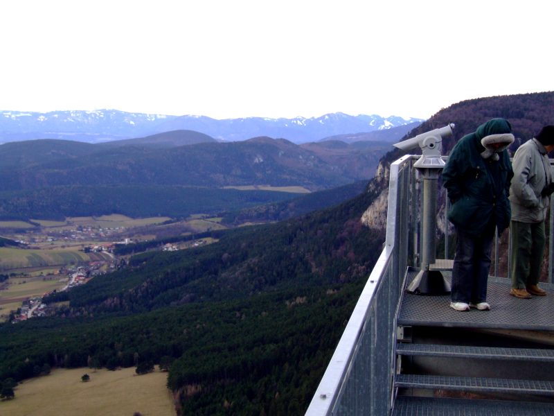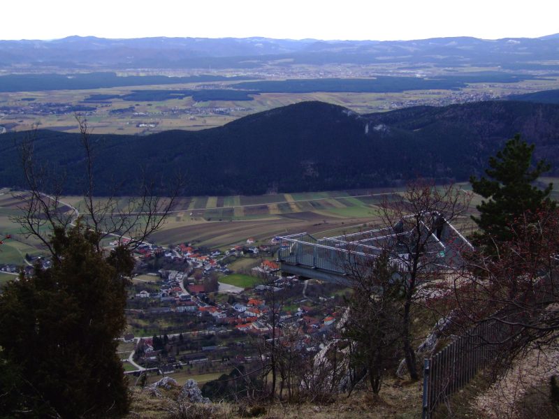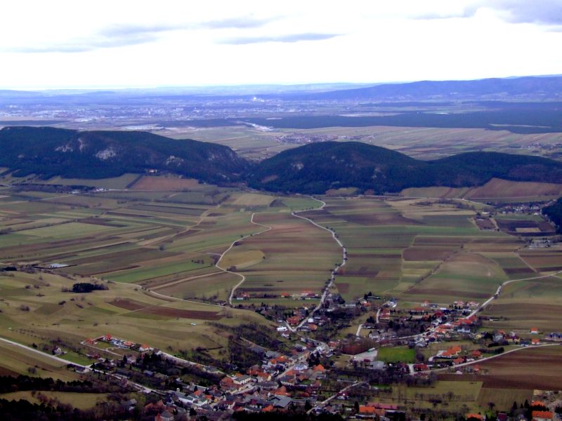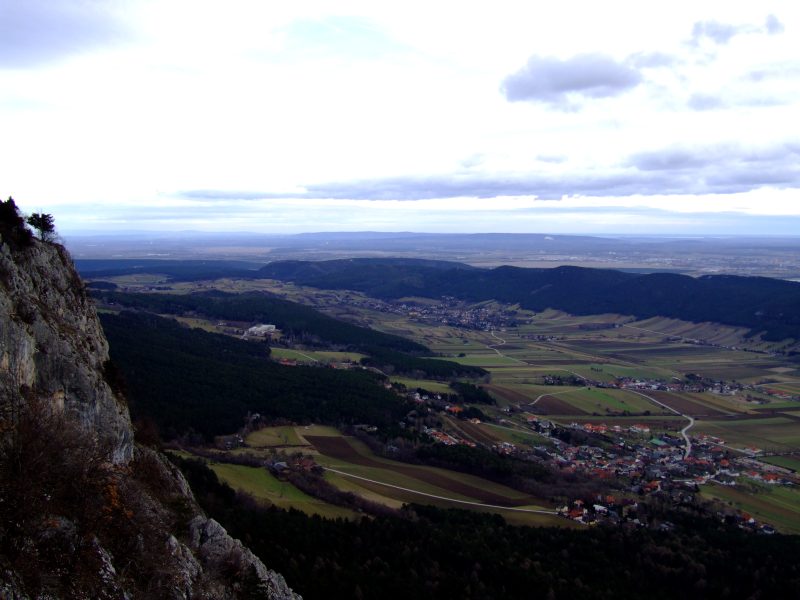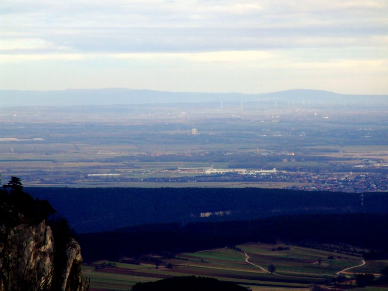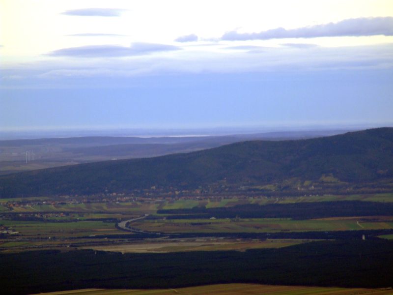 View from Hochkogelhaus: Maiersdorf and "Neue Welt", Fischauer mountains, then behind the southern Vienna´s plain. The light bar close to the horizon is lake Neusiedel in a distance of about 50 km air line.