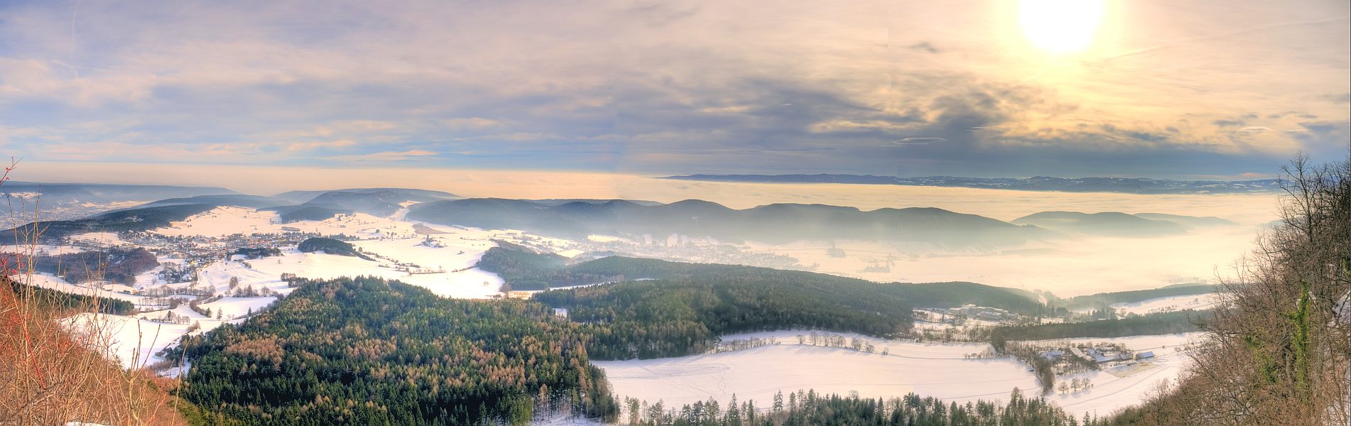 Panoramic view from Herrgottschnitzerhaus. Far left in the valley is Piesting, then Dreistetten, Muthmannsdorf and Neue Welt, behind are the Fischau mountains in front of the mist-covered southern Vienna´s plain.