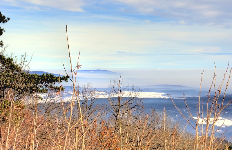 Blick über die Neue Welt und die Prosset-Schlucht zum nebelbedeckten südlichen Wiener Becken mit dem Rosaliengebirge und der Buckligen Welt dahinter.