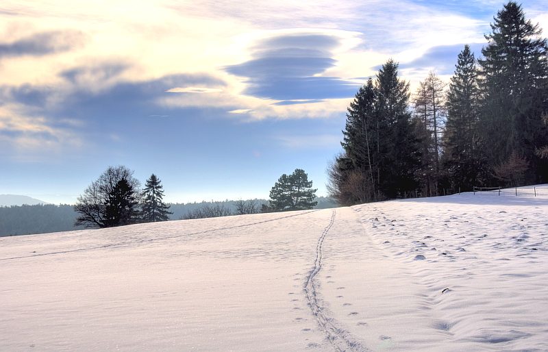 Wieder herunten nahe Dreistetten; jetzt scheint auch hier die Sonne. Am Himmel aber bereits Föhnwolken.