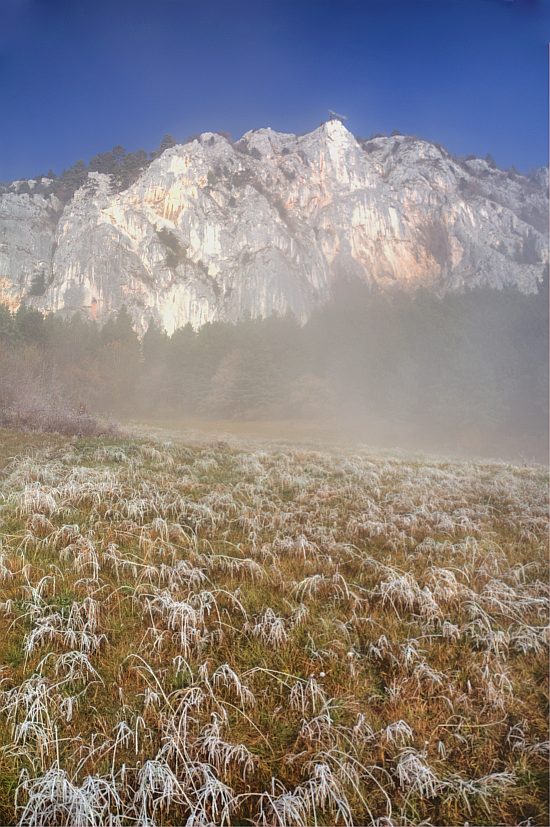 Der Nebel reicht heute nicht sehr hoch hinauf, sodass ich schon am Wandfuß auf die ersten Sonnenstrahlen stoße.