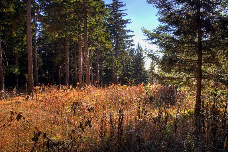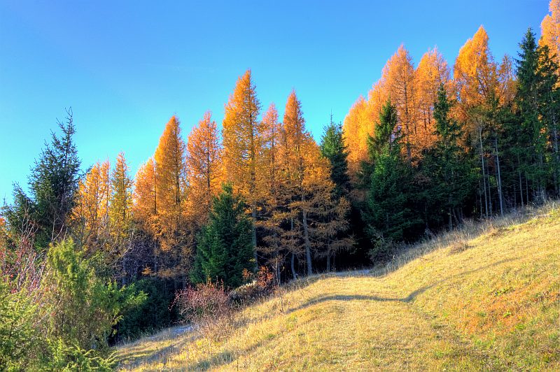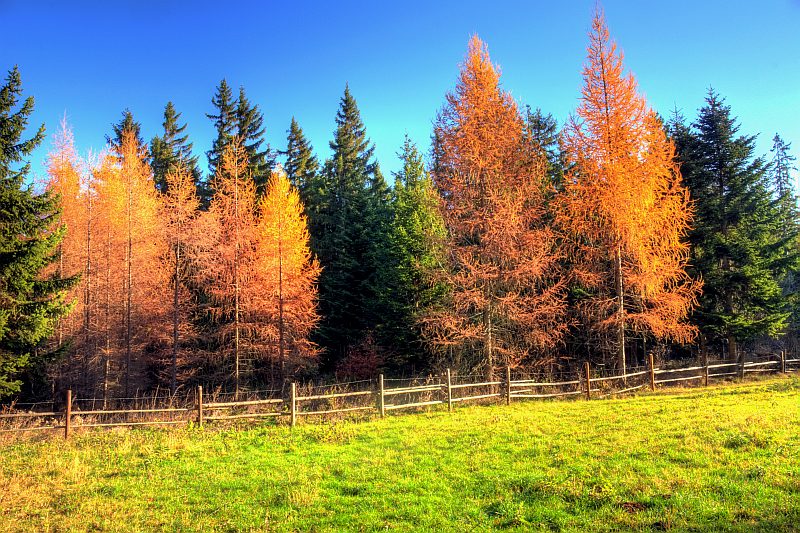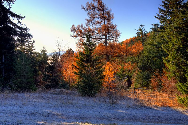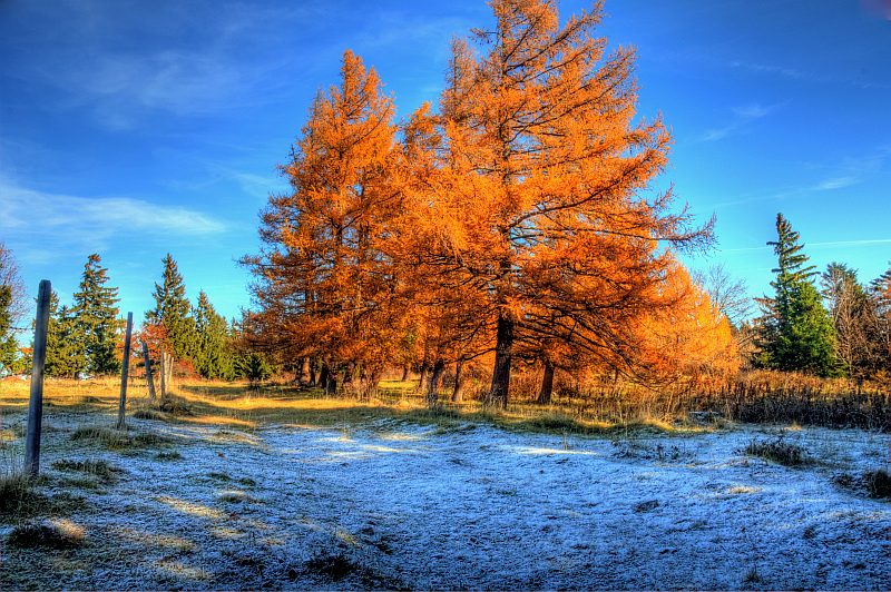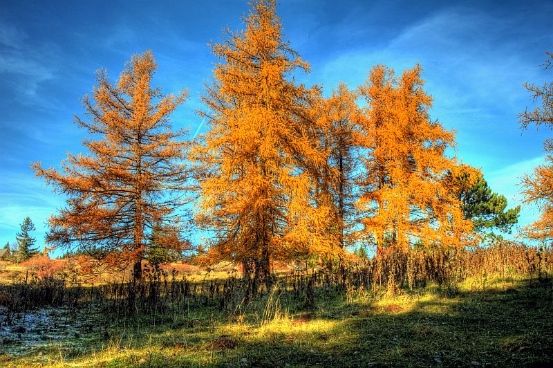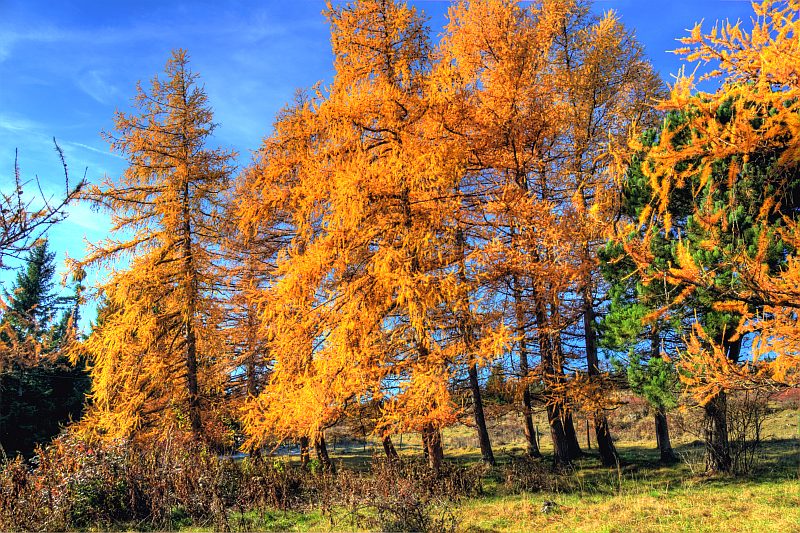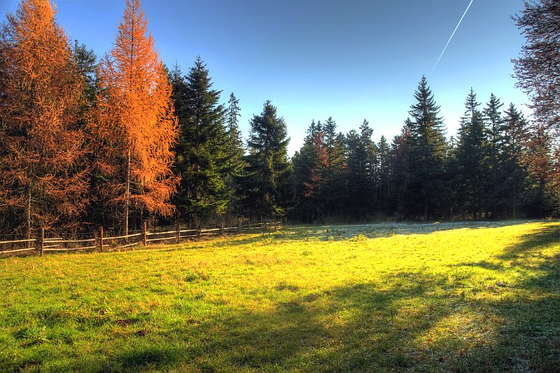 Ein letztes mal fahre ich ein Stück auf der Straße Richtung Herrgottschnitzerhaus. Unterwegs spaziere ich ein wenig über eine Wiese und finde diese wunderschöne Lärchengruppe.