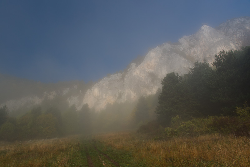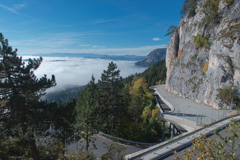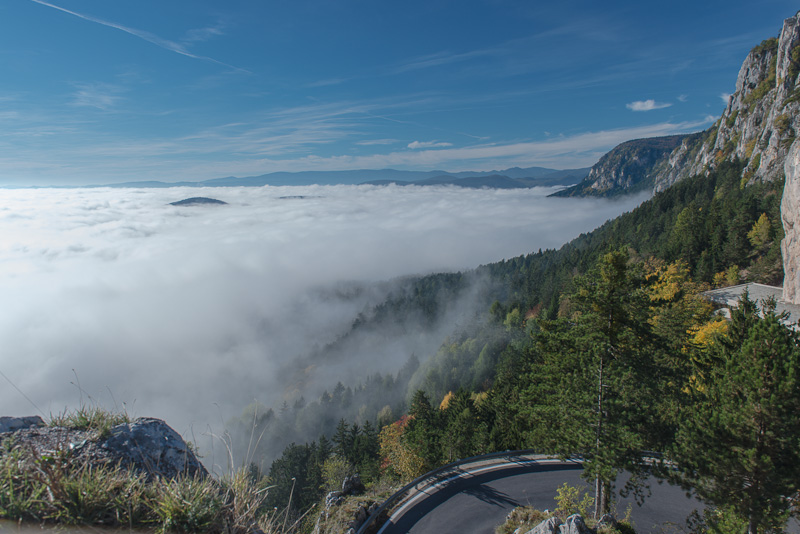At the parkin place at the big curve of the road still some mist, but there is a first glimpse of the sun.