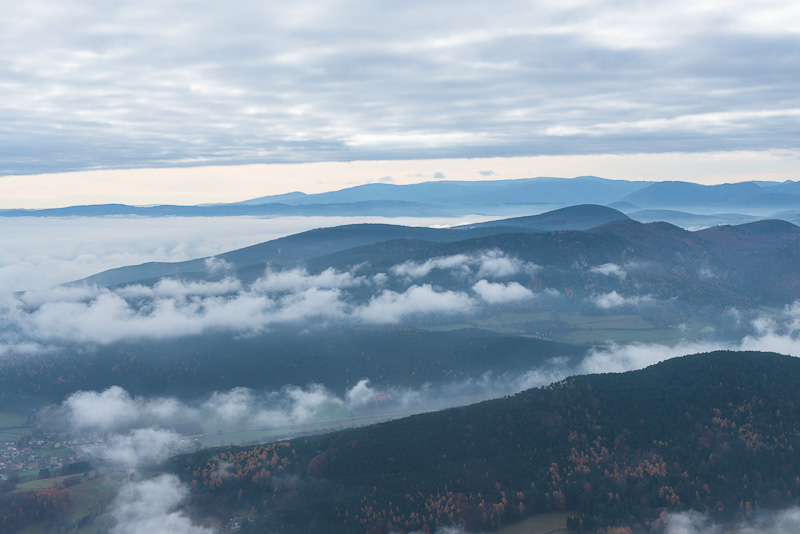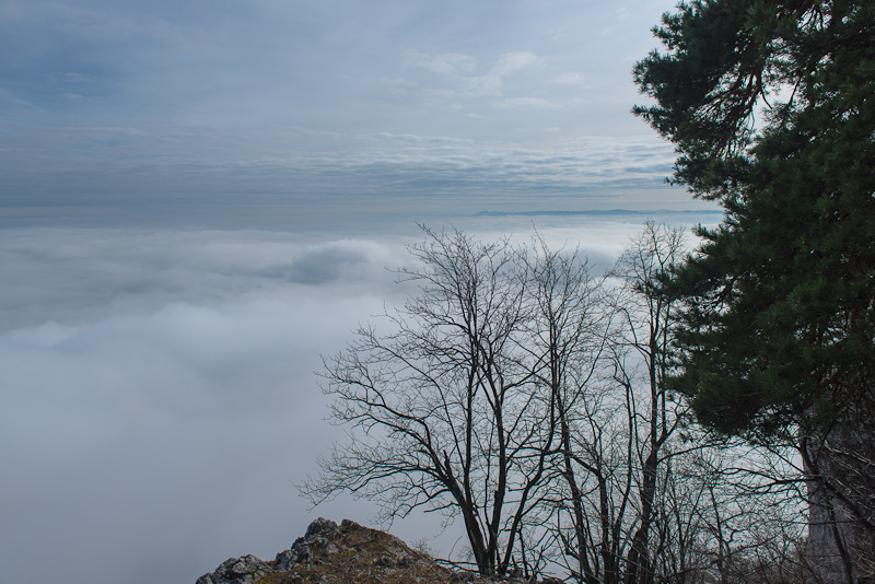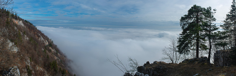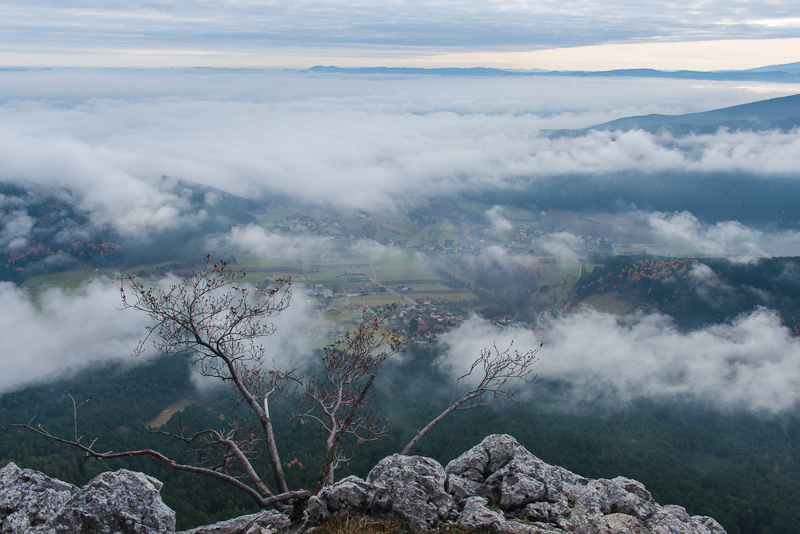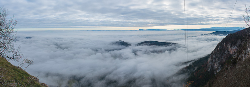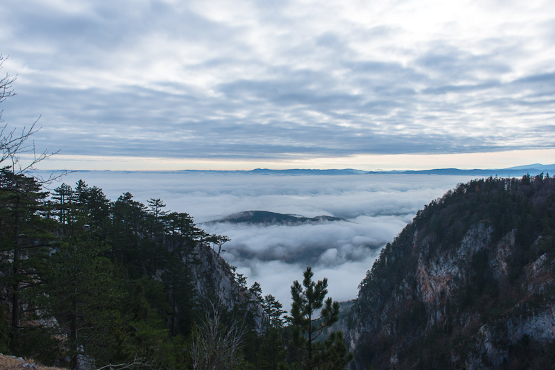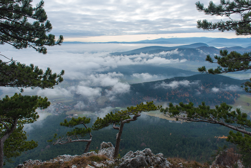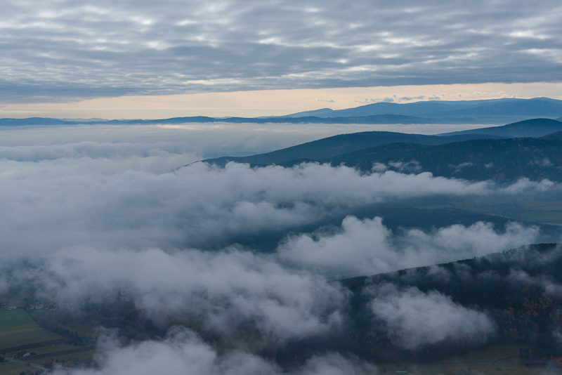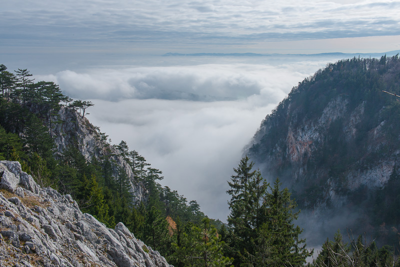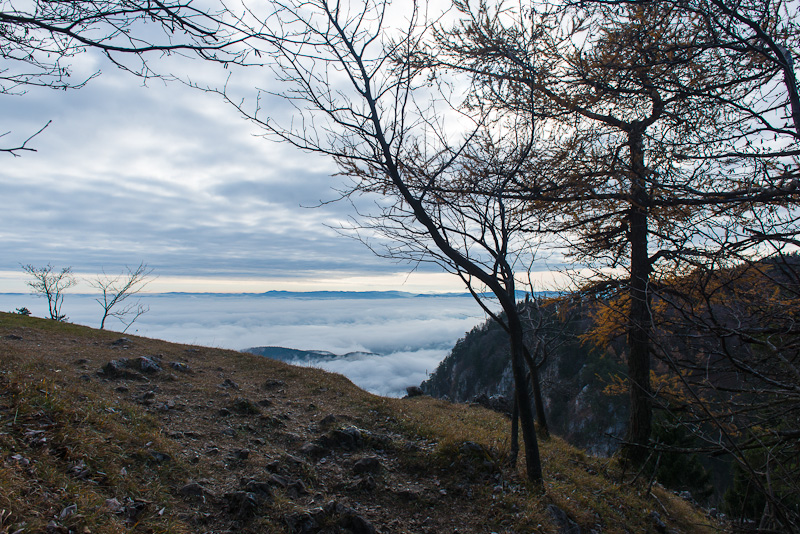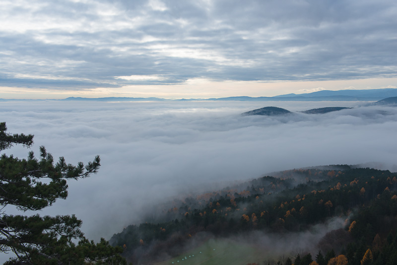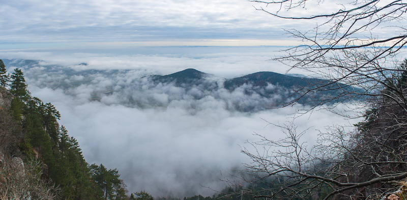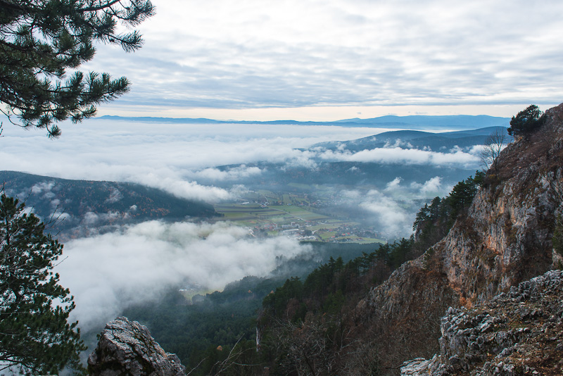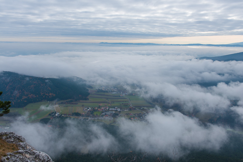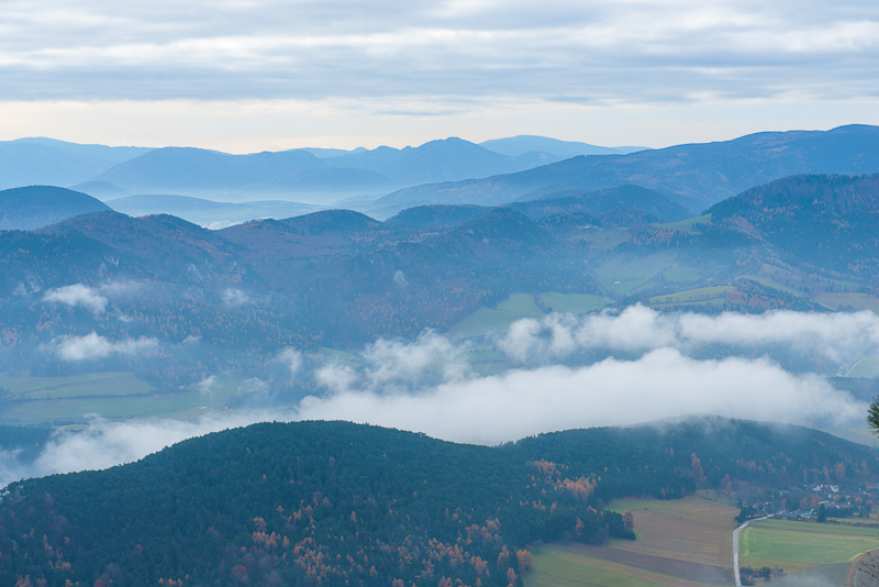 View from the road up Hohe Wand to Rosalia and Wechsel. Kienberg pokes out of the mist like an island.