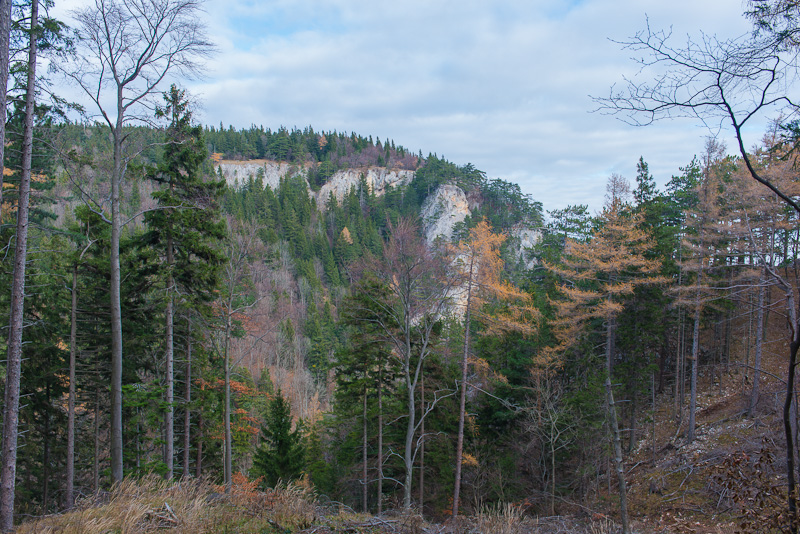 Rocks, trees and a yawning abyss - a 100 m high vertical wall.