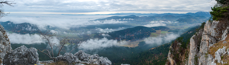 Panoramic view from the western Hohe Wand in direction Höflein. Far right is Grünbach. Click here or into the picture for a larger version.