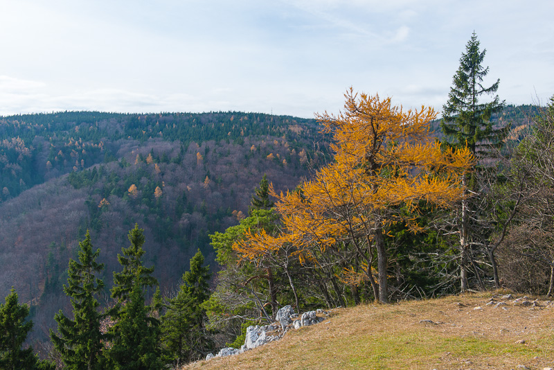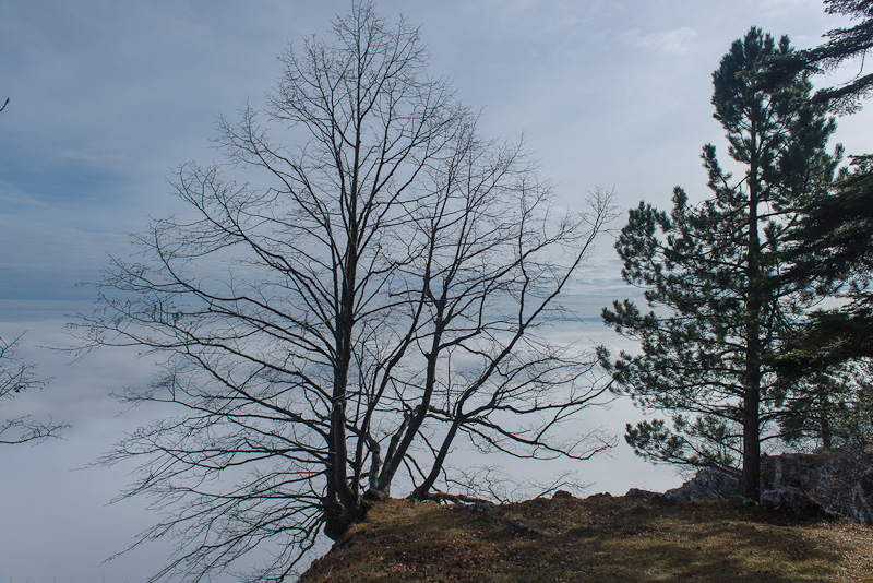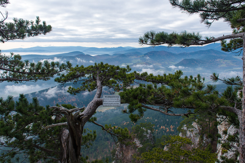 This place near the Hochkogelhaus is named "Neue Welt Blick" ("Neue Welt view"), because you can look down very well from here to the flat valley at the foothills of Hohe Wand called "Neue Welt" - provided the view is not inhibited by fog, like today. Click here or into the picture for a larger version.