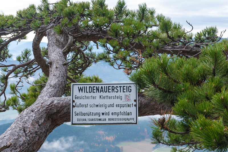 The plate says: "Wildenauersteig - ferrata. Extremely difficult and exposed. Use of a climbing rope is recommended" (in fact, in guidebooks as well in the link shown above, this route is classified as "D" on the difficulty scale of ferratas ranging from A - easy to D - difficult. More pictures from within the route are shown at the link). Probably the most difficult ferrata of the Hohe Wand.