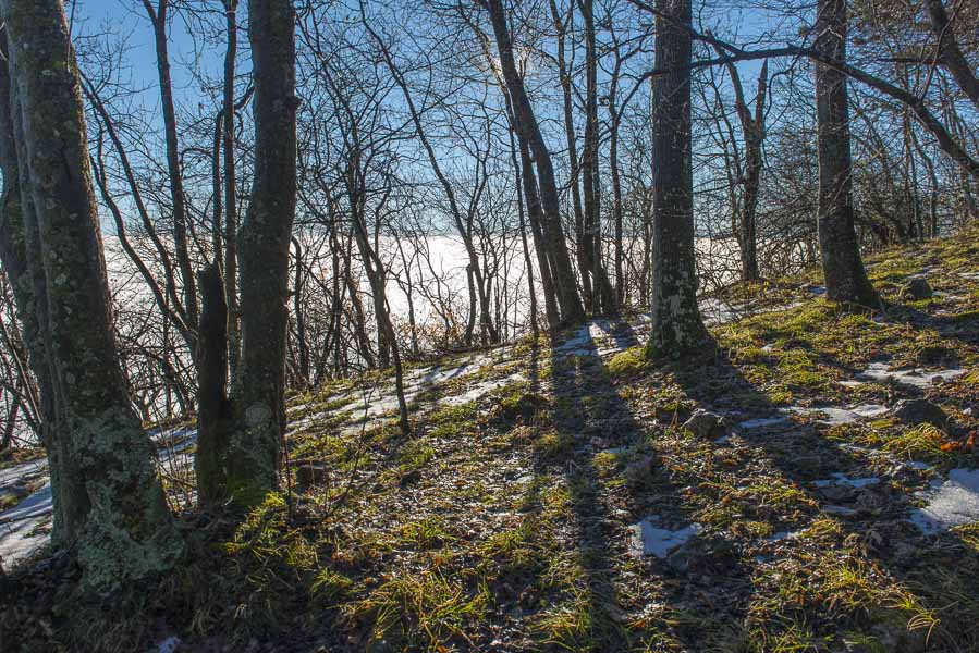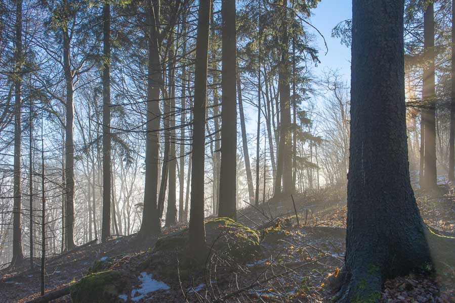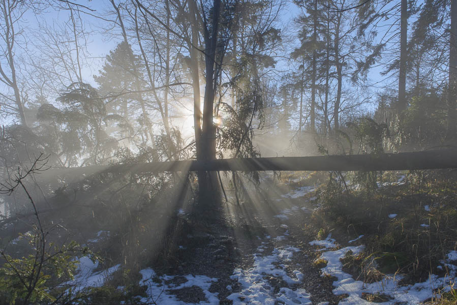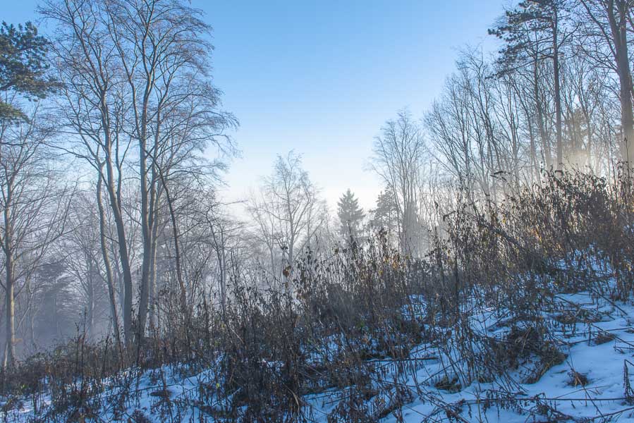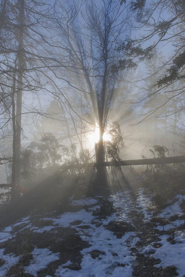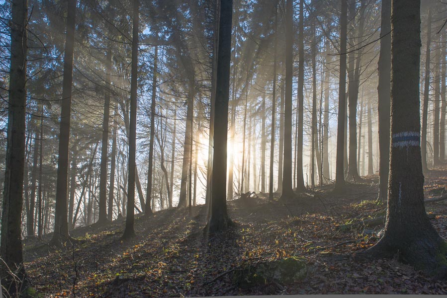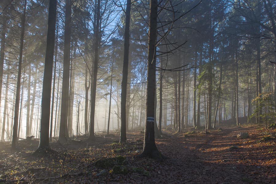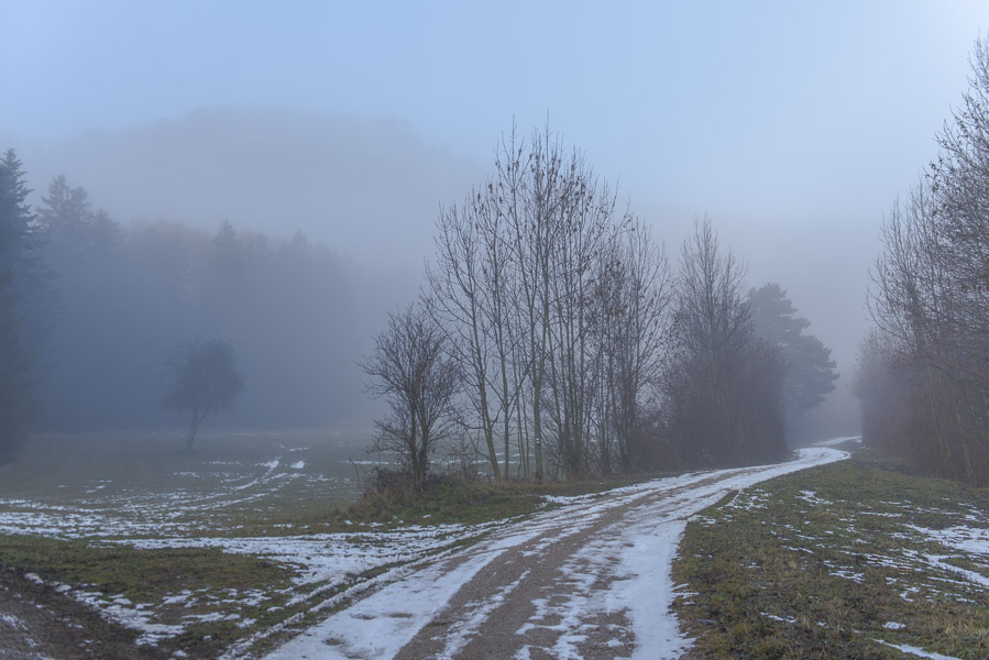 Noch bevor der Weg in den Wald eintaucht, sieht man bereits die Kontur der Hohen Wand durch die obersten Schichten des Nebels durchschimmern.