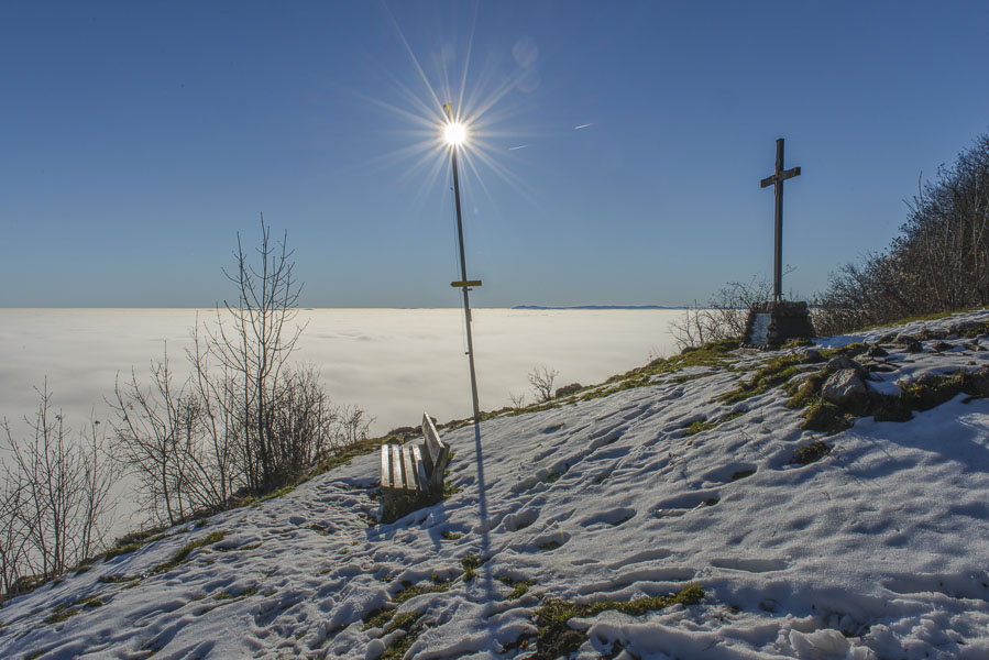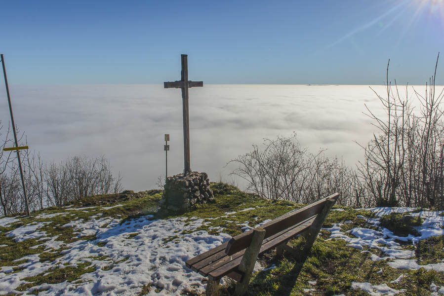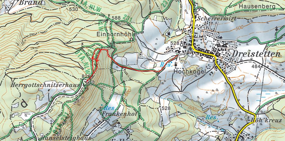 Der gestrige Hochnebel ist stark abgesunken, www.Schneeberg.tv zeigt heute früh, dass der Nebel bereits knapp oberhalb des Wandfußes der Hohen Wand zu Ende ist. Eine Autofahrt bis nach Losenheim so wie gestern ist daher nicht notwendig, um dem Nebel zu entkommen. Da ich ohnehin nicht den ganzen Vormittag Zeit habe, fahre ich kurzerhand nach Dreistetten und wandere von dort zum Herrgottschnitzerhaus.