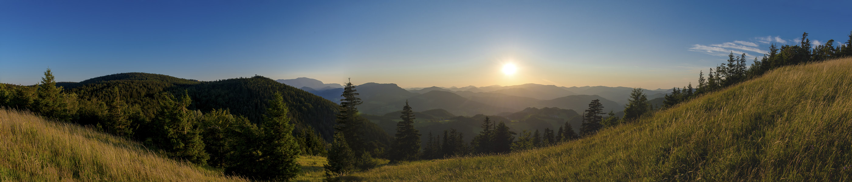 Abendliches Panorama in westlicher Richtung, von der Wiese unterhalb des Waldeggerhauses.