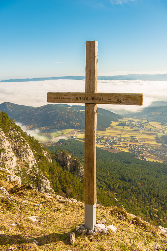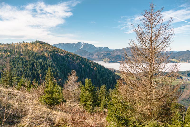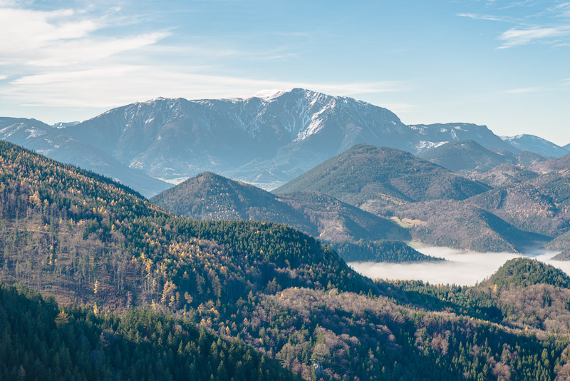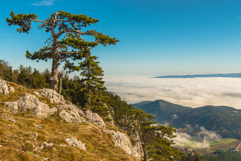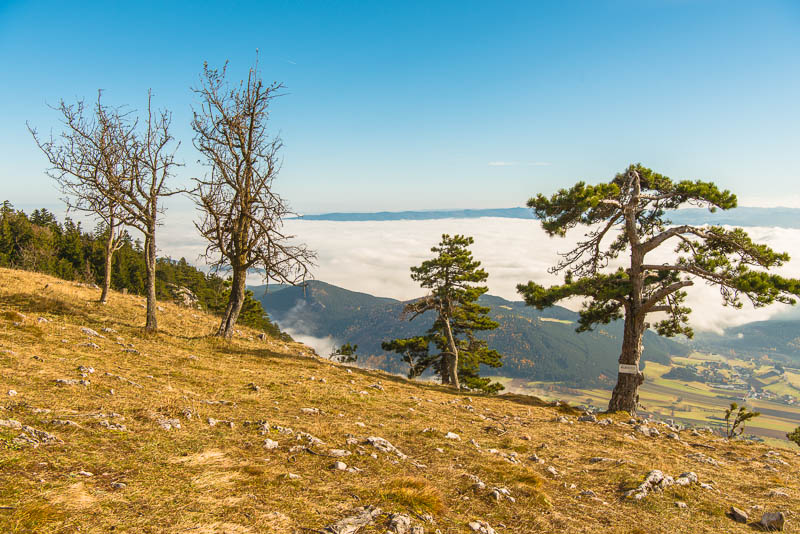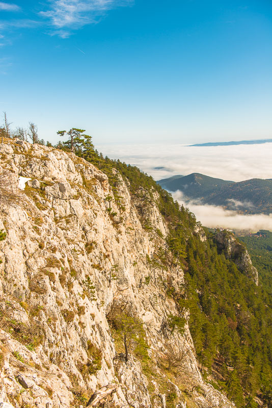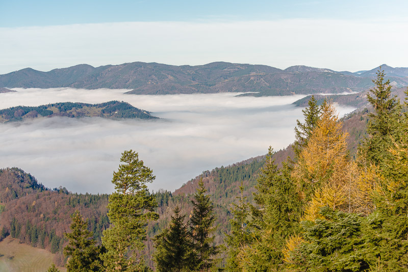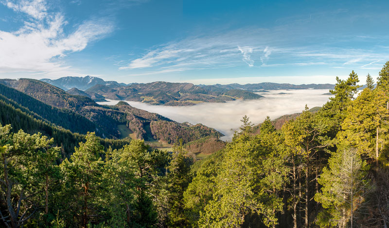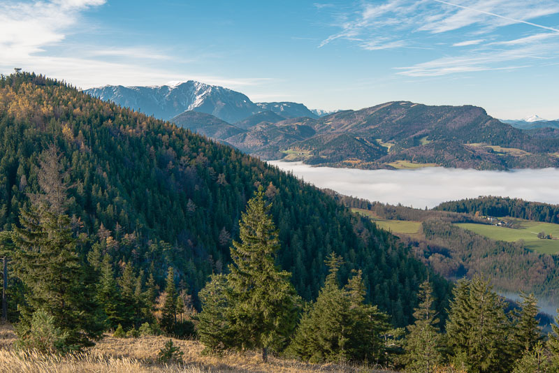 Kurz nach der Kleinen Kanzel wurde viel Wald geschlägert, deswegen hat man von dort jetzt einen Blick über das Plateau der Hohen Wand und über den Nebel zum Rosaliengebirge und zur Buckligen Welt.
