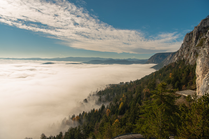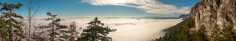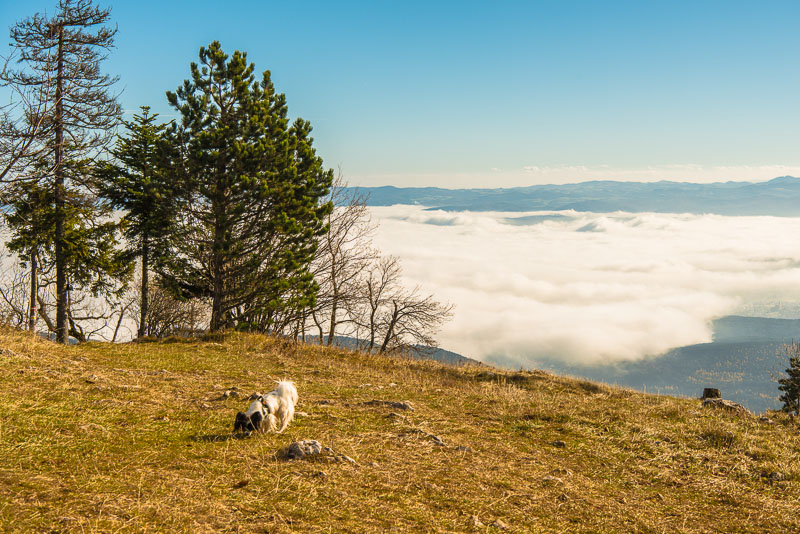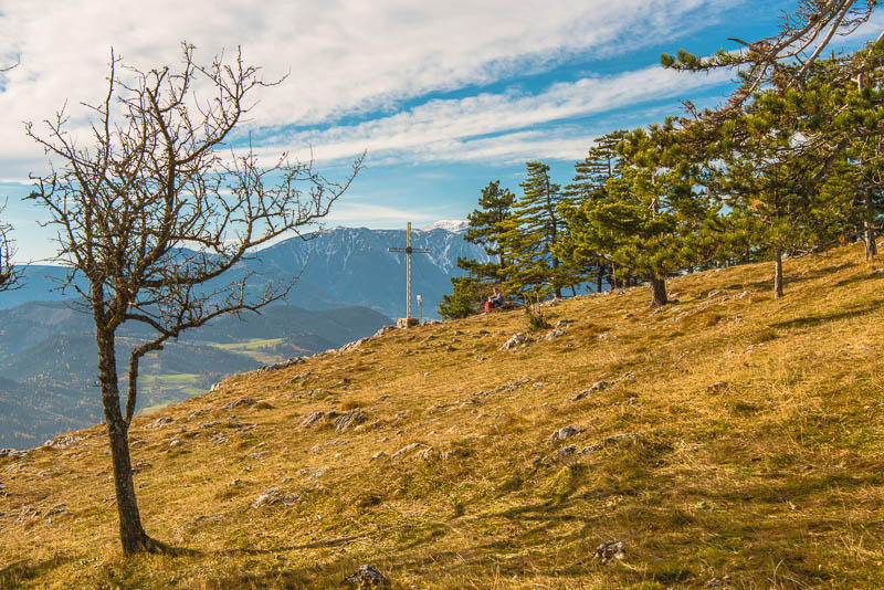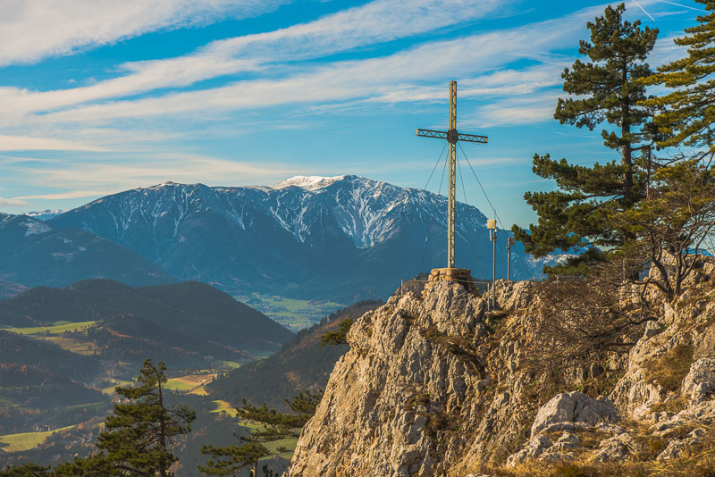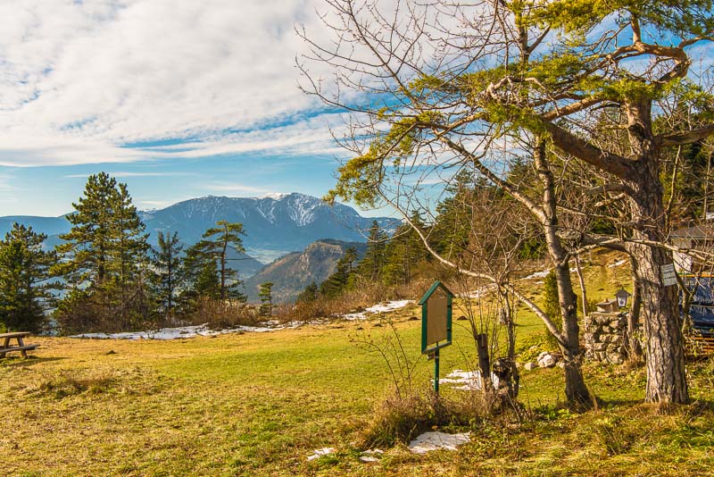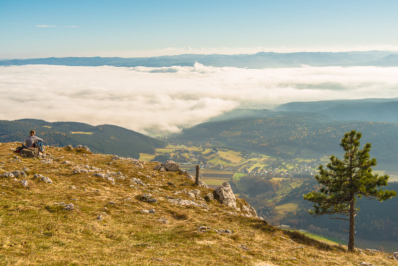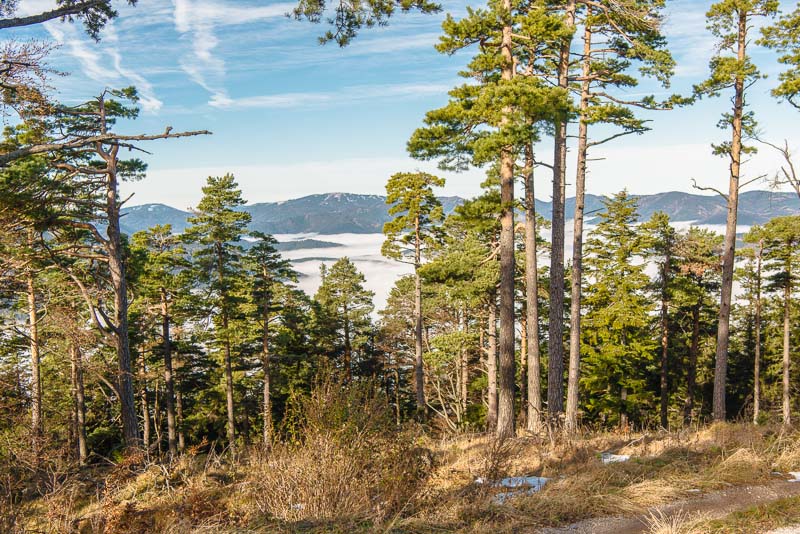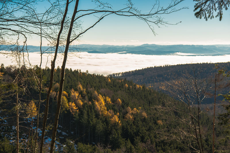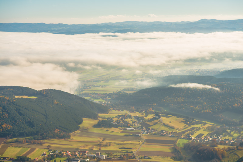 Kurz nach der Kleinen Kanzel wurde viel Wald geschlägert, deswegen hat man von dort jetzt einen Blick über das Plateau der Hohen Wand und über den Nebel zum Rosaliengebirge und zur Buckligen Welt.
