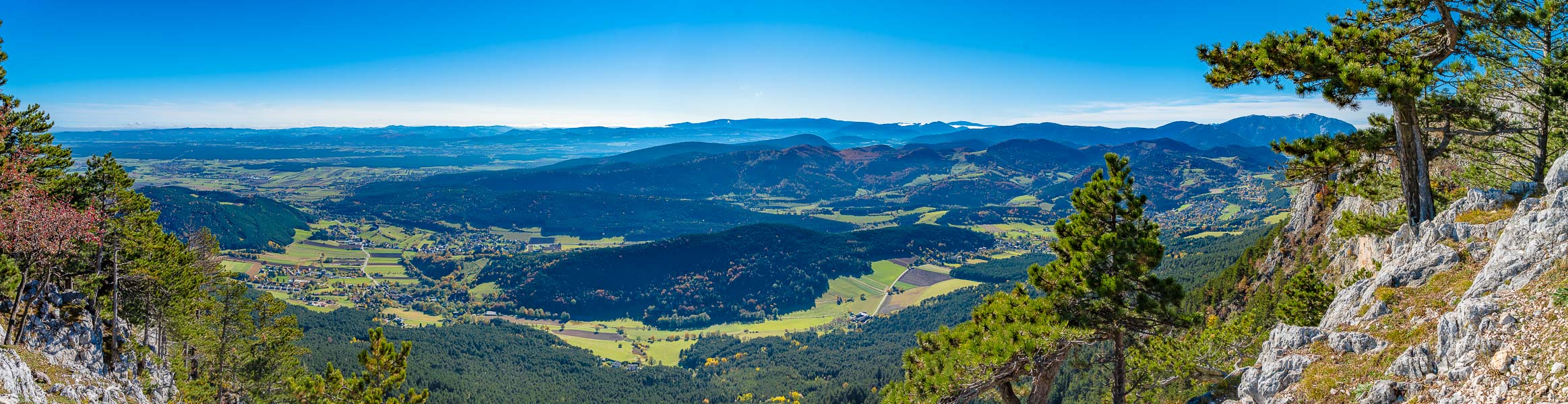 Panoramablick von der Hohen Wand (Naglkreuz) nach Süden - Höflein, Neusiedl, Grünbach und Schneeberg. Im Hintergrund Rosalia, Bucklige Welt, Wechsel und Semmering.