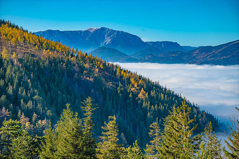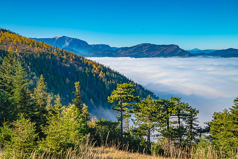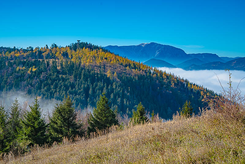 ... und wenn ich aus dem Wald komme, öffnet sich der übliche grandiose Blick auf die Gutensteiner Alpen und den Schneeberg.