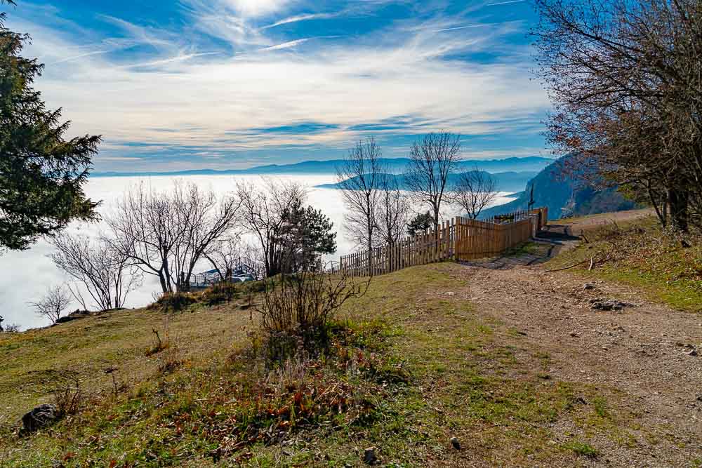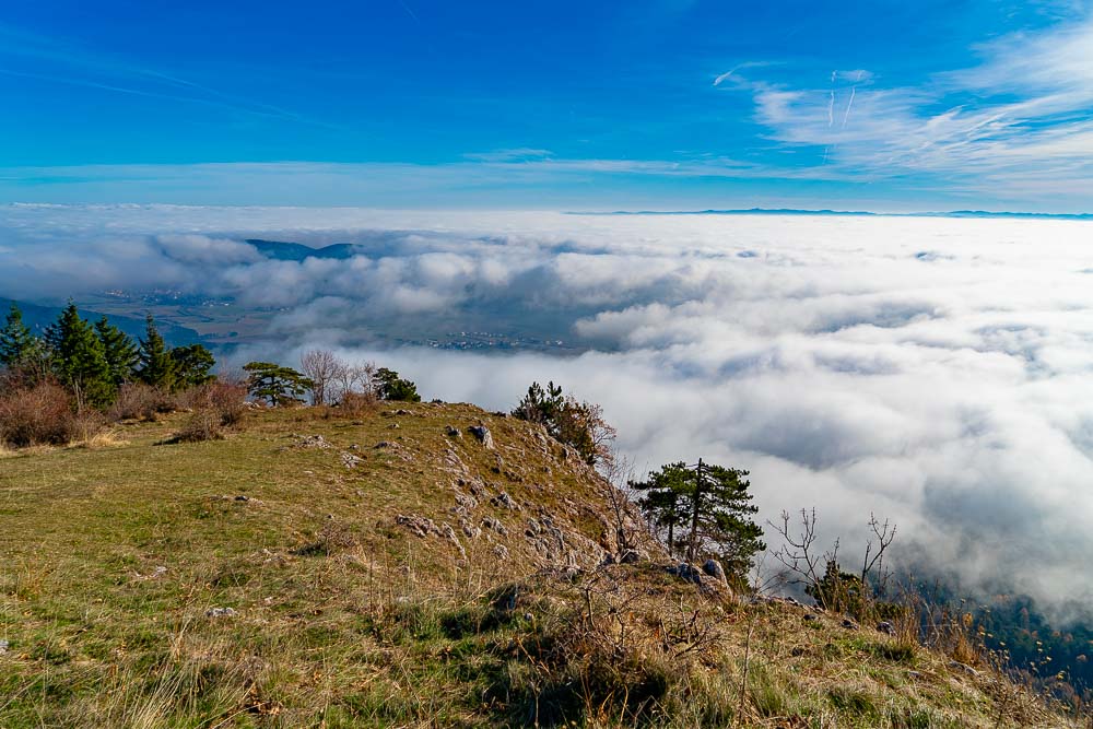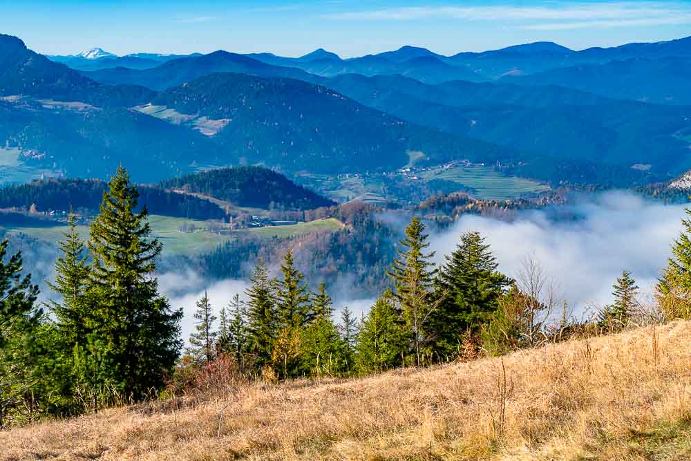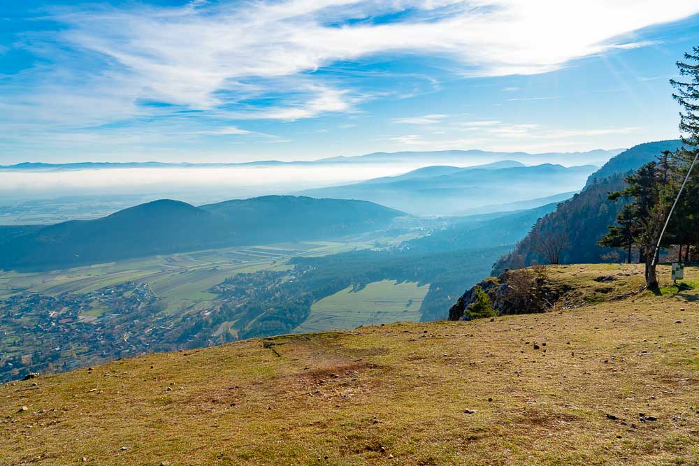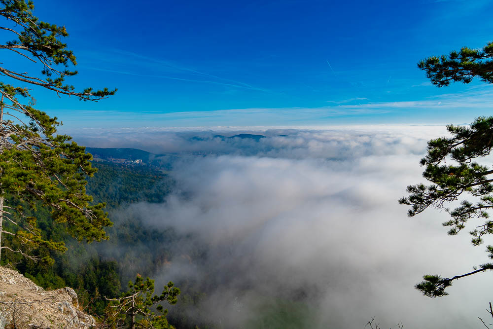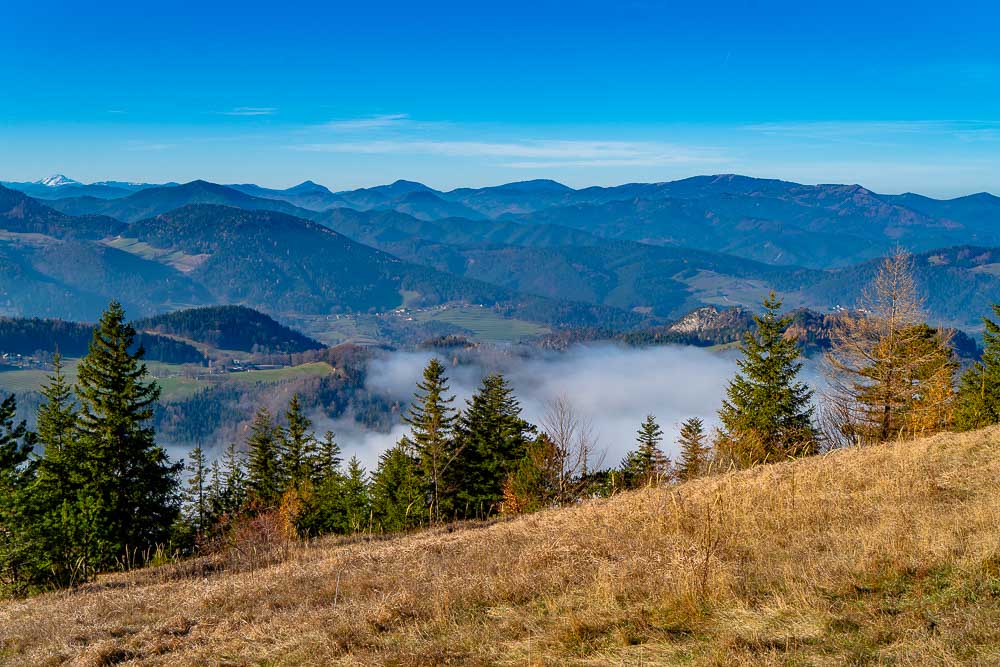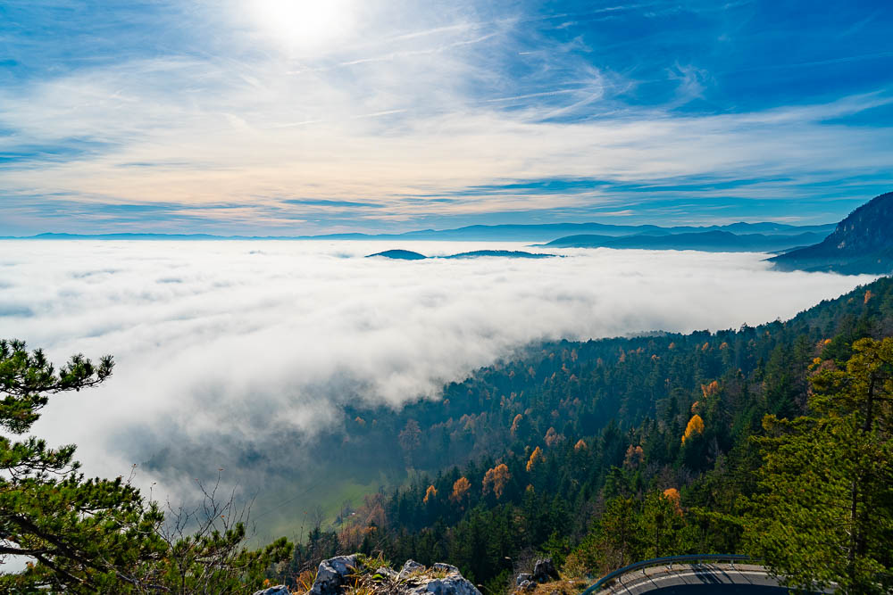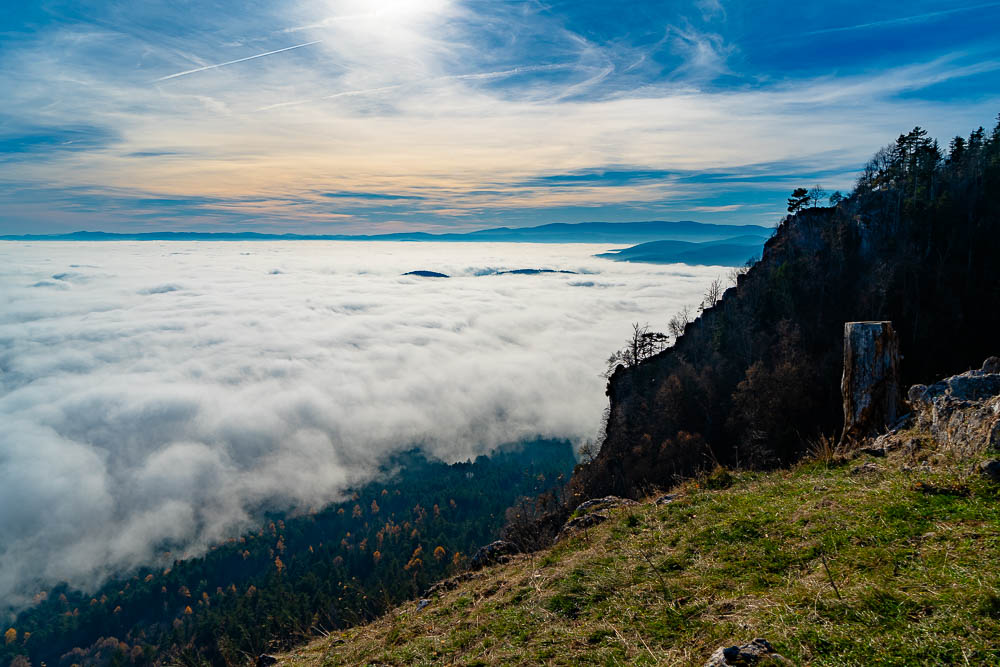 First view over the mist at the uppermost hairpin bend od the Hohe Wand road.