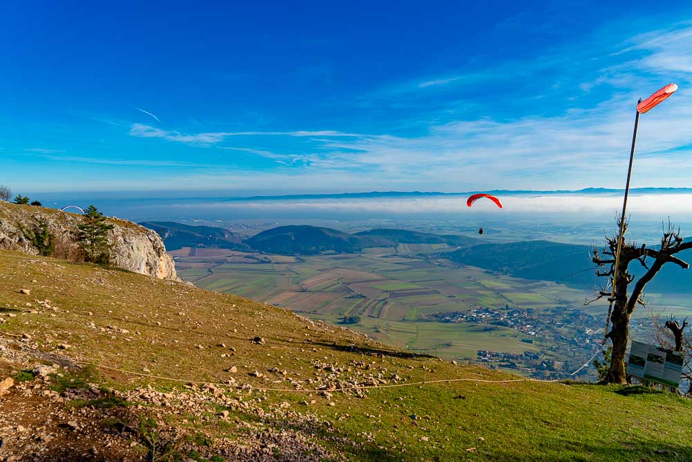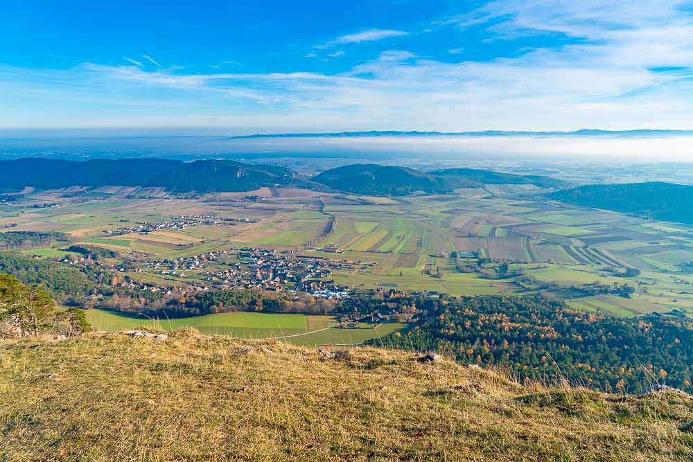 View down to Maiersdorf, with Kienberg behind, in the background is the Wechsel massive and the Bucklige Welt.