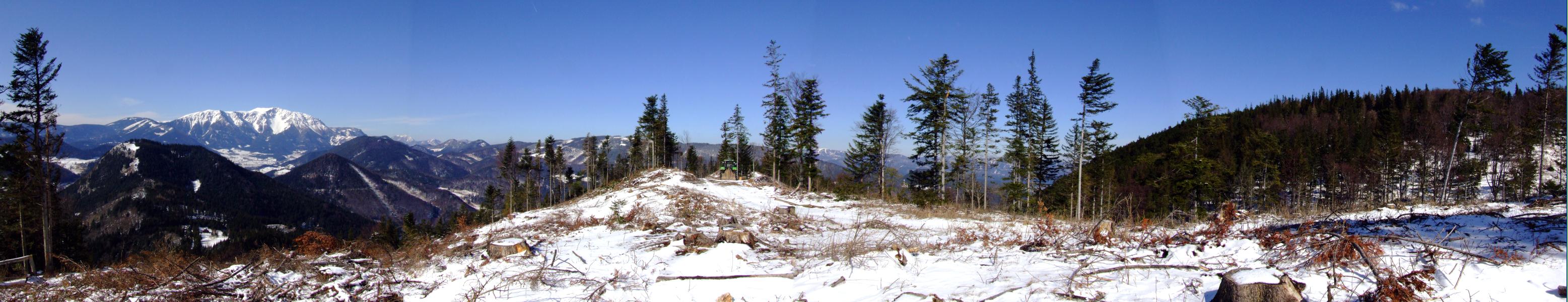 Panoramablick von etwas unterhalb des Plackles über das Geländ zum Schneeberg