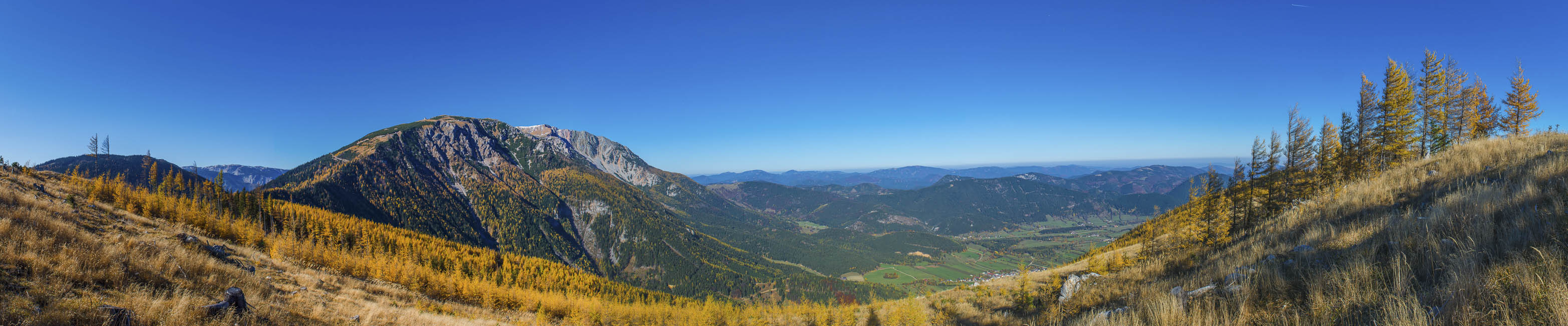 Panoramic view from Hoher Hengst to Schneeberg and over the Puchberg valley. Far left Krumbachstein and Rax.