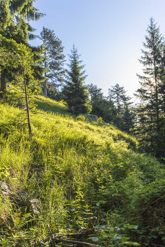 Luckily I find the path which is overgrown by stinging nettles, narrow and not waymarked wich circumvents the short escarpment on the left side and then goes up aloing a narrow, wodded ridge up to the summit of Hoher Hengst führt. From the way up a first good view to Schneeberg.