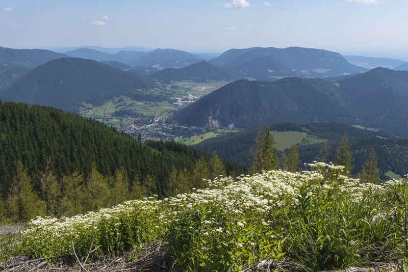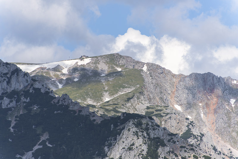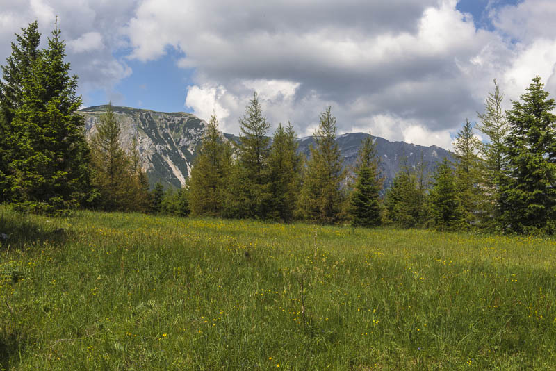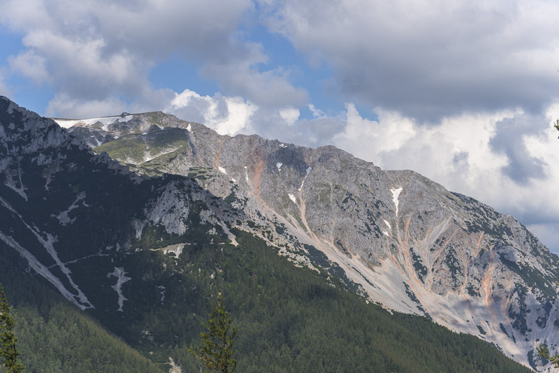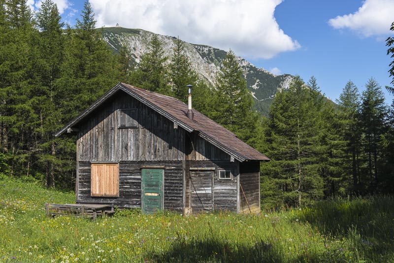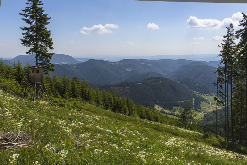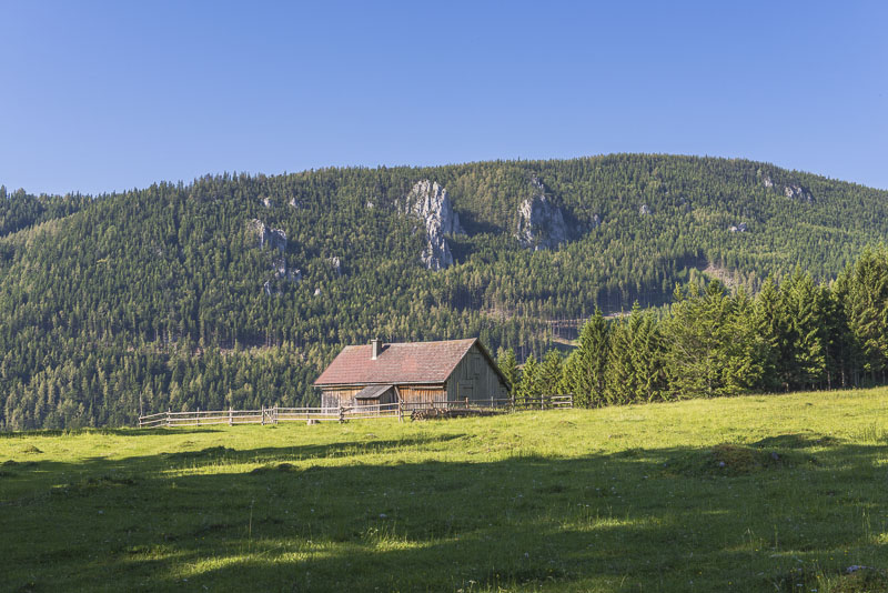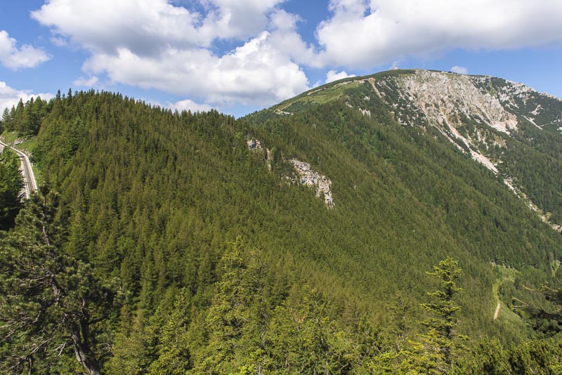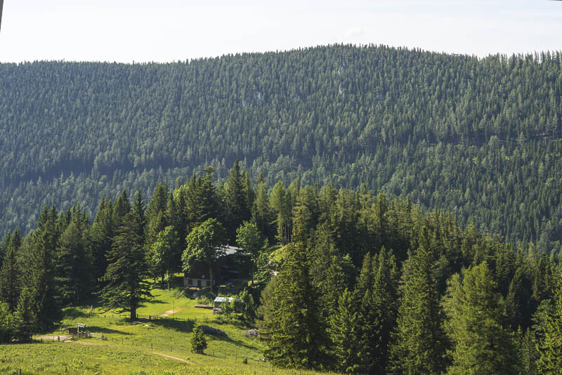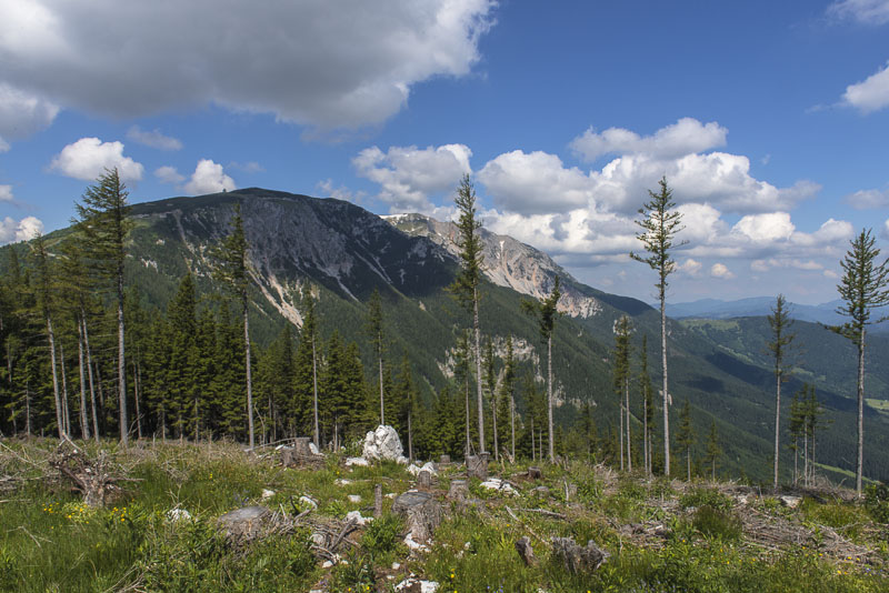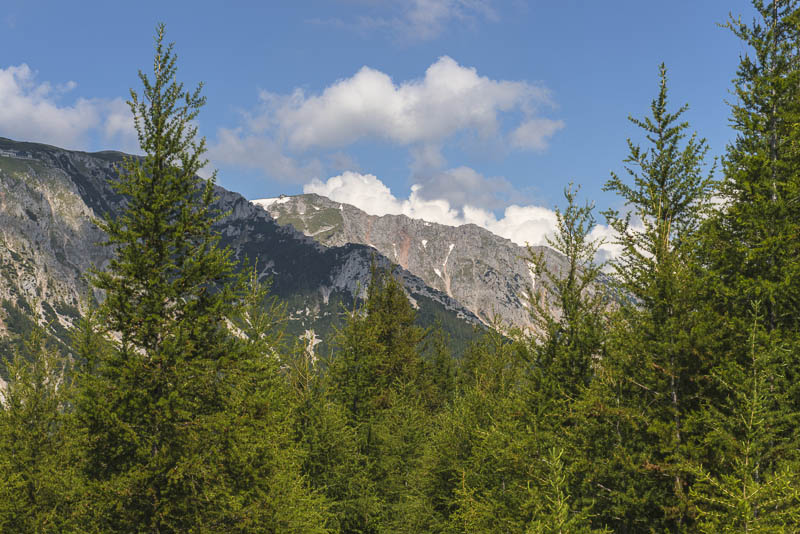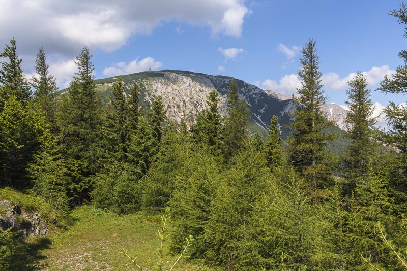 View back to the Ternitzer Hütte, which is a bit hidden in the forest, and to the Gahns - massive.