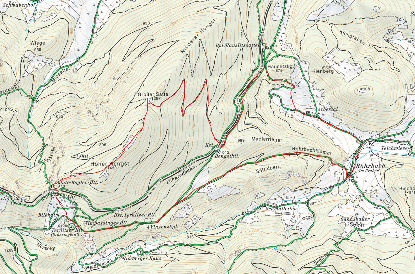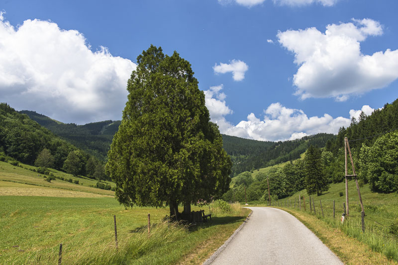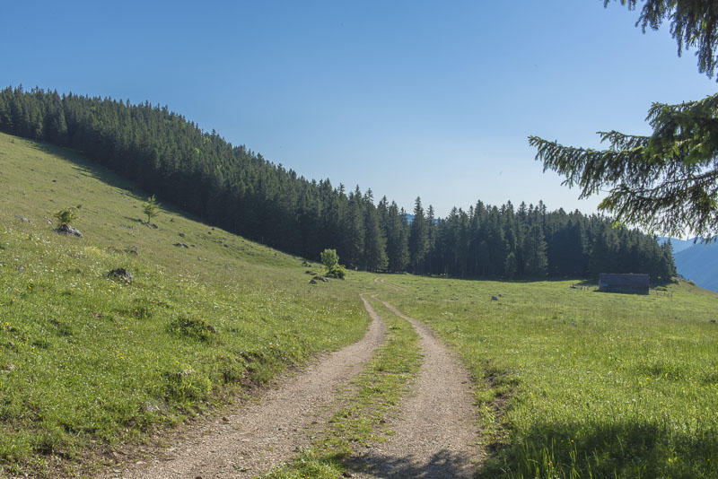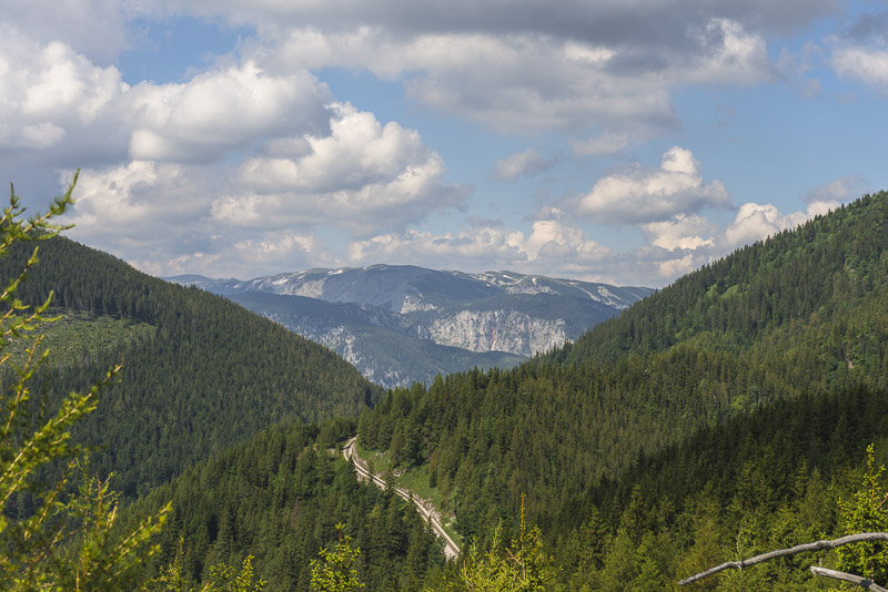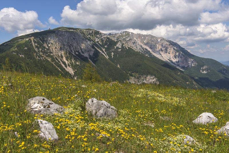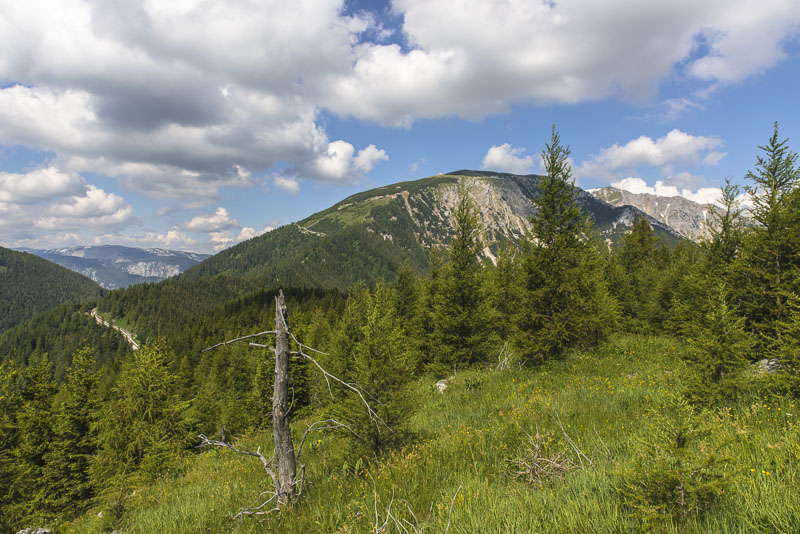 Großen Sattel ("Big saddle", 1.287 m). A last veiw to Schneeberg; now it s to skirt down the gravel road to the Hengsthütte and through the Arbestal back to Rohrbach.