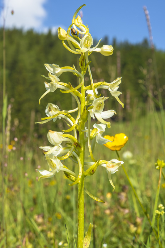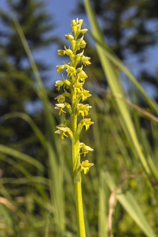 Small White orchid (Pseudorchis albida) is growing in the grass between the trees.