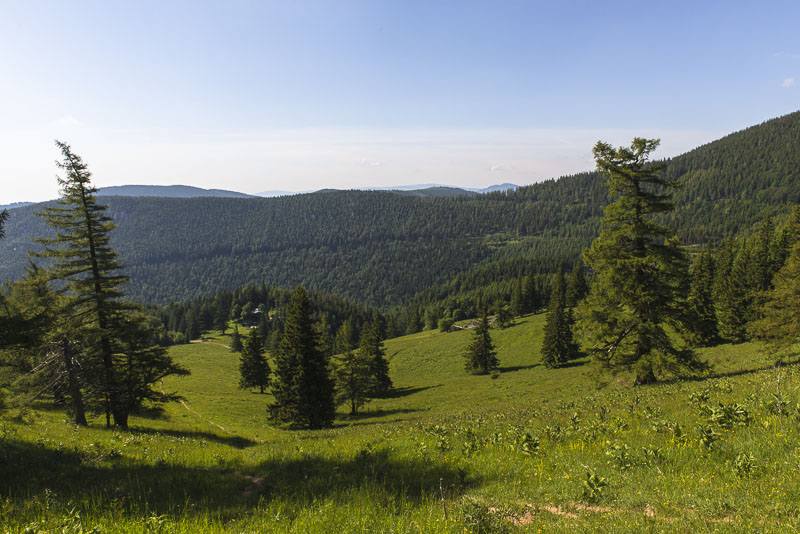 The grassland of the Bilekalm, with the Ternitzer Hütte below.