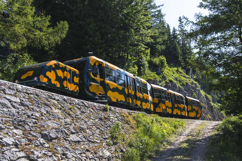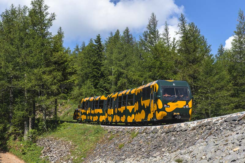 AT the uppe rend of the pasture there is the Kaltwassersattel, here by chance I meet a train of the Schneebergbahn, not knowing, that the Pietsch family has its praxis-free day and is sitting in the train (looking out of the window on the opposite side not seeing me).