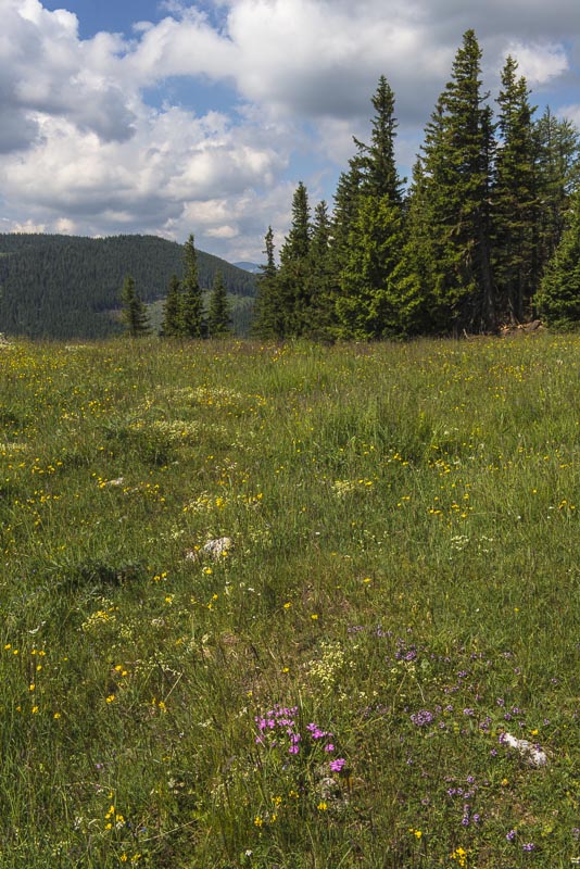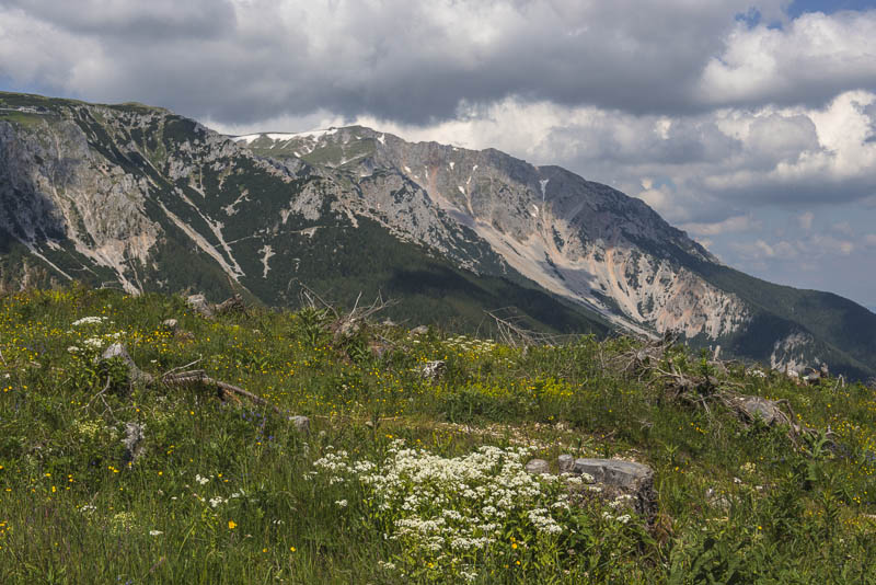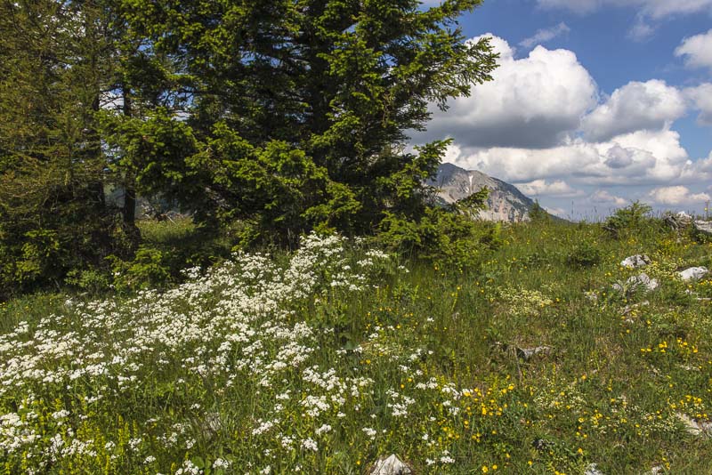 Descending down to the "Großer Sattel" In this deforestated area, large patches of Garlic cress (Peltaria alliacea) have established.