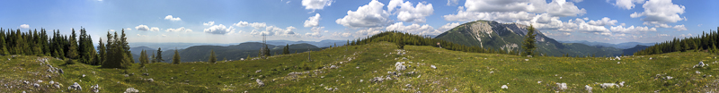 360 degree panoramic picture seen from a bit beneath the summit of Hoher Hengst (1.450 m). Click here or into the picture for a larger version.