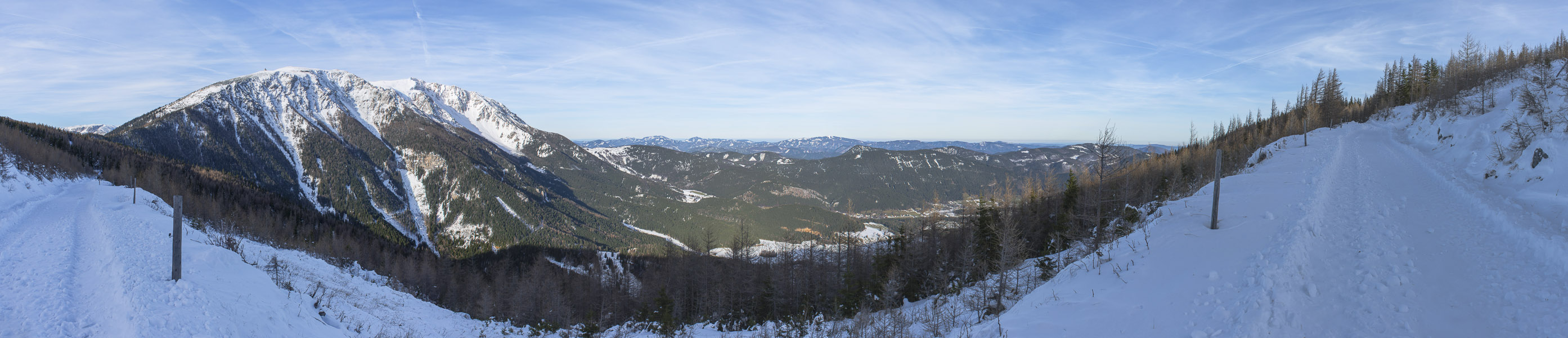 Panoramic view from close beneath the ridge of Hoher Hengst. Far left the Rax, then Schneeberg and the Gutenstein Alps with the Unterberg. Dürre Wand to the right.