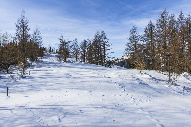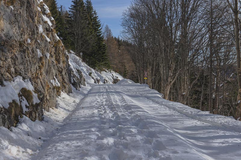 In the background to the left you see the reason for the thorough snow cleaning of the road - an occupied hunter´s lodge ... nobody seems to care about the bloody innards of yesterday´s kill laying around in the snow near the hut ... hunters are crazy people, indeed!