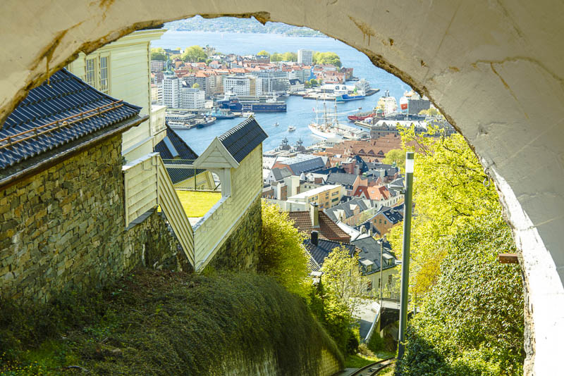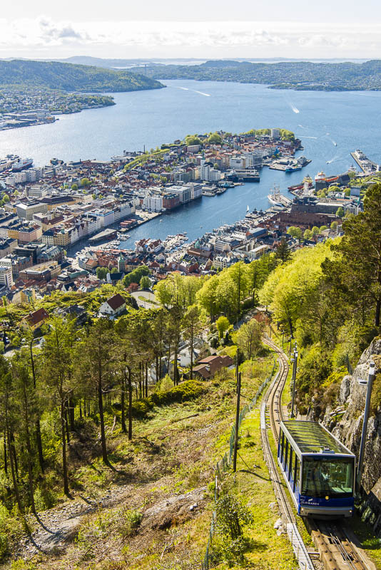 Direkt vom Hafen zweigt eine Seitenstraße ab, an deren Ende ein weißes Gebäude steht: die Talstation der Fløybahn, mit der wir nun auf den Berg hinauf fahren.