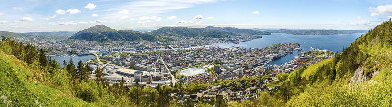 180 Grad Panoramablick über Bergen von der Aussichtsterrasse am Fløyen. Hierher oder ins Bild klicken für eine größere Darstellung.