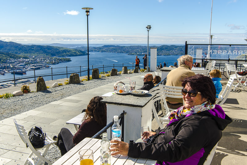 Das Kaffehaus auf dem Fløyen ist ein wenig schleißig, aber man bekommt was zu Trinken (mit Selbstbedienung).